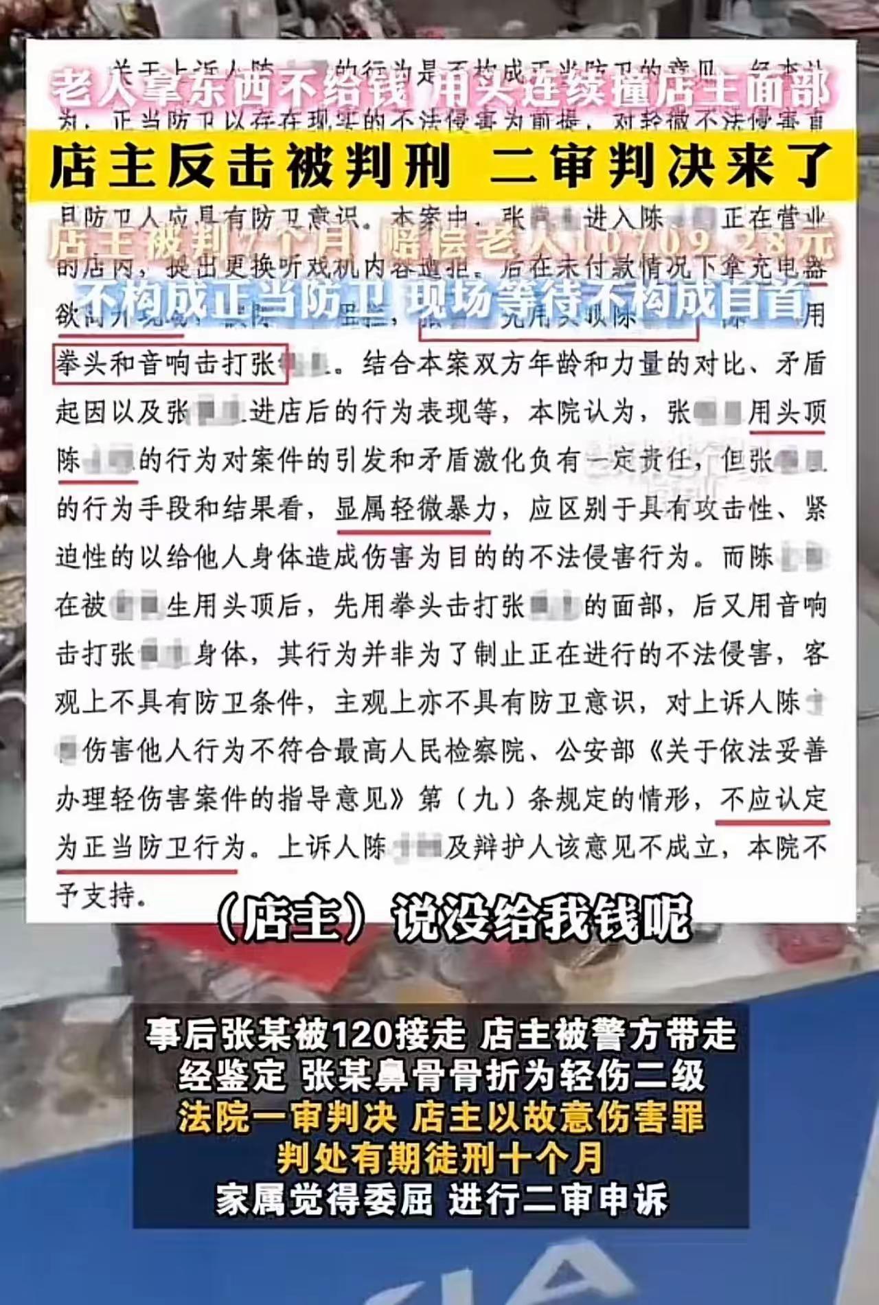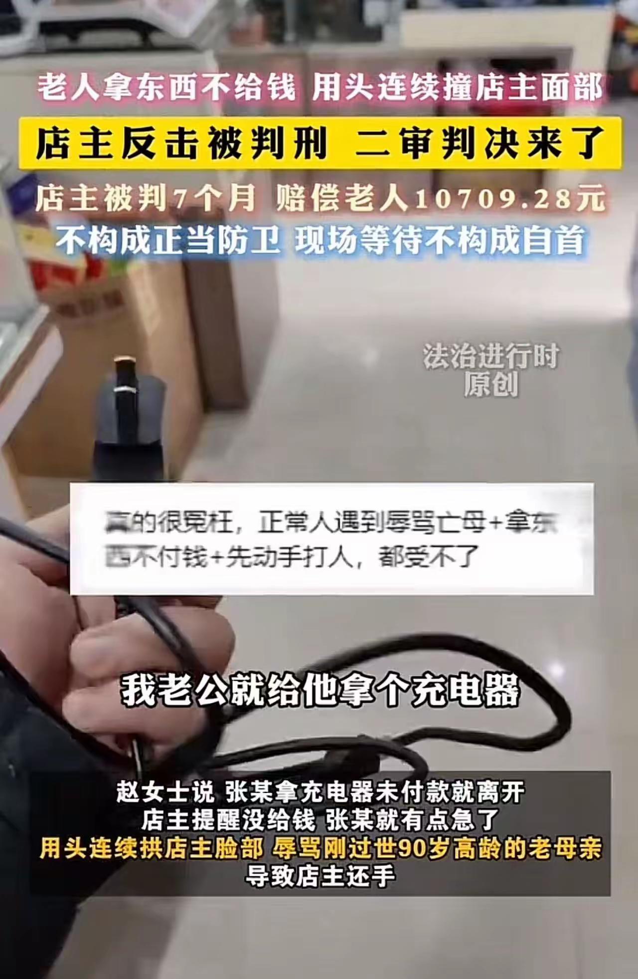 “是他先用充电器砸人,还拿我过世的老母亲戳我心窝子,我难道连还手的资格都没有吗?”法庭上,面对法官的宣判,王女士看着丈夫被带走,哭得几近昏厥。她怎么也想不明白,自家明明是开门做生意的老实人,被一个无理取闹的老人欺负到头上了,怎么法律最后保护的却是那个“恶人”? 这件事在网络上引发了巨大的撕裂。很多人看完监控视频后,第一反应都是气得浑身发抖——画面里,老人拿着充电器不付钱就要走,被店主拦下后,非但没有丝毫羞愧,反而像发了疯一样,用头连续顶撞店主的脸。这还不算完,见店主一直在忍让,老人竟然使出了最恶毒的一招,指着店主的鼻子,咒骂他刚刚去世、年仅90岁的老母亲。 这一骂,彻底击碎了一个孝子最后的理智。俗话说“祸不及家人”,更何况是刚过世的至亲。在这个瞬间,我们看到的不是一个精明的商人,而是一个被侮辱了母亲、血性上涌的儿子。他挥出的那一拳,与其说是为了泄愤,不如说是在捍卫自己作为人子最后的尊严。 然而,法律是冰冷的。法院认定,虽然老人先动手,但在被拉开后,双方的冲突已经暂时停止。此时店主挣脱阻拦追上去击打对方,属于“事后防卫”,不构成法律意义上的“正当防卫”,因此以故意伤害罪判刑七个月,并赔偿一万余元。 这一纸判决,让无数网友破防了。大家愤怒的点在于:难道面对无赖的持续羞辱,我们只能当缩头乌龟吗?难道就因为对方是老人,就可以肆无忌惮地践踏别人的底线,甚至靠“年龄优势”在法律的边缘疯狂试探? 这起案件之所以能引爆舆论,是因为它触及了每个人内心深处的恐惧:当我们的亲人被侮辱,当我们的尊严被踩在脚下,法律要求的“绝对理性”,究竟是在保护弱者,还是在纵容恶人? 透过现象看本质,这起案件其实给所有普通人上了一堂血淋淋的社会课:在冲突中,情绪一旦越过法律的“时间线”,有理也变成了没理。那位老人固然可恨,但店主正是因为咽不下那口气,从“被害人”变成了“被告人”。 我们同情店主的遭遇,但更该心疼这家人的未来。七个月的牢狱之灾,一万多元的赔偿,以及伴随终身的案底,这代价实在是太沉重了。这也警醒我们,在面对垃圾人时,或许报警、或许拉开距离让他去祸害别人,才是对自己和家人更负责的选择。否则,为了出一口气,搭上自己的后半生,最终亲者痛、仇者快。 对于这起“老人挑衅,店主还手被判刑”的案件,你觉得法院的判决是维护了法律的尊严,还是凉了好人的心?如果是你,面对这种辱及先人的挑衅,你能忍得住吗?欢迎在评论区留言,说说你的看法。