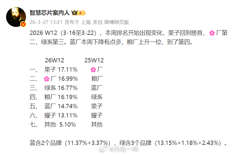 3、看心小米排名第四,位置不算高。但这一周小米的份额提升较大,估计是没涨价的原因导致的。