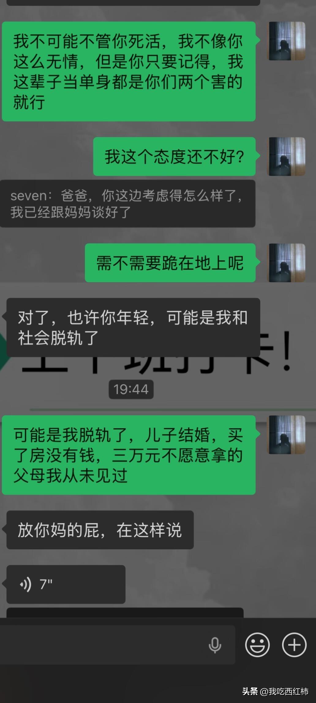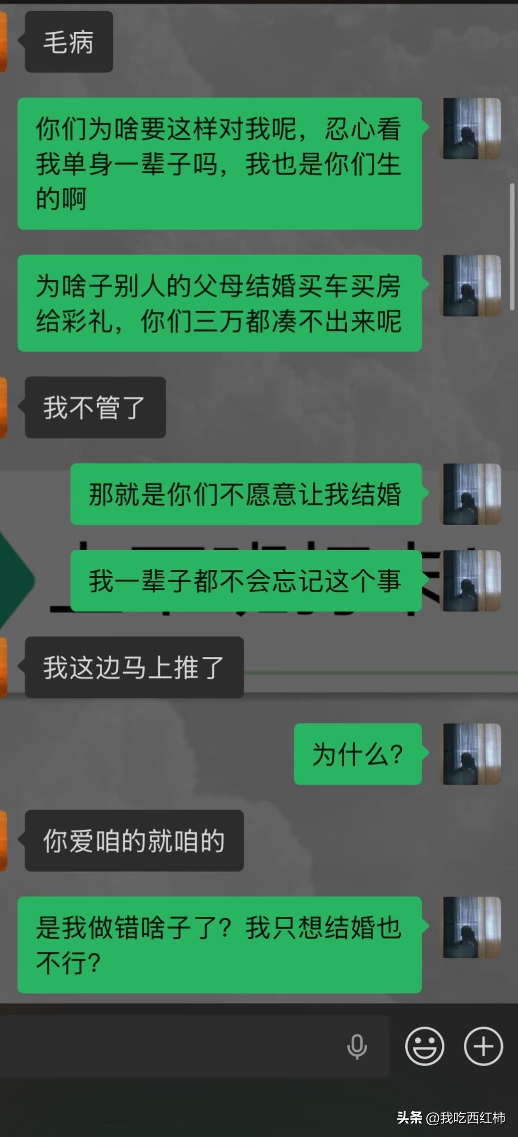 当你有一个不负责只知道一味催婚的父母 天天被催,确实有点烦了,但是我特别了解我的父母,他们都是特别在乎钱的人,他们并不缺钱,从我记事以来就活得很好,经常打大麻将,我爸在我需要买房的时候说没钱,转头去买了一辆蔚来的新能源车四十多万,我妈二嫁以后更是锦衣玉食,经常买名牌包包,作为儿子来说,我为他们感到高兴。 经济上我从不依附她们,连房子也是我自己买的,但是他们经常因为亲戚对我的“催婚”,实则就是挖苦,而感到面子过不去来给我施加压力。 这次让我相亲,我不再说不去了,我说去,前提是需要给我三万块我更有安全感,因为刚买了房身上一分钱都没了。 然后我爸直接说给我推了,大骂我是神经病,我妈直接已读不回。 最后,我想说,我没有抱怨什么,我甚至没有要求过他们什么,他们过得好就行。 但是我仍然想说,不愿意尽责却执着催婚的父母和冷眼旁观的远方亲戚没有任何区别,他们只想让自己的所谓的面子过得去,但凡沾上一点利益,就会立马说“不管了”“你有病”。 当然,我想我也要感谢我的父母,他们一直以来就是这样自由自我地活着。让我意识到,人这一辈子,可以为自己活着,只活成自己。