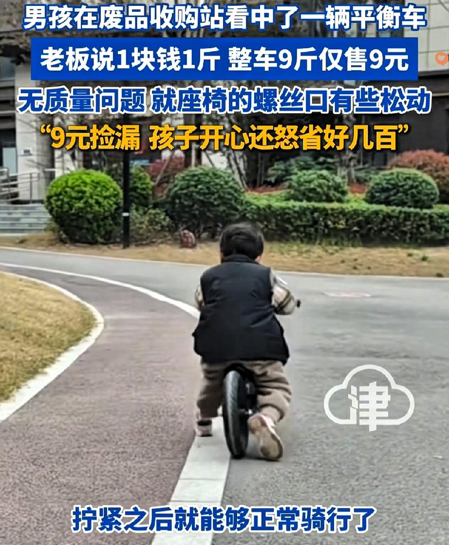 谁能想到,快乐居然能按斤称,还只要九块钱。 河南一位小男孩路过废品站,一眼就盯上了角落里的平衡车,家长本以为要花不少钱,没想到老板直接按废品计价,一块钱一斤,称完九斤,九块钱直接带回家。 车子只是有点小毛病,简单收拾一下就能正常骑,孩子骑着车神气十足,一路都透着藏不住的开心。 很多大人买东西总看重品牌和价格,挑挑拣拣还容易踩坑,可孩子的眼光纯粹又直接,只认准自己喜欢的,反而能捡到意想不到的惊喜。 有时候快乐根本不用花大价钱,一双善于发现的眼睛,比什么都珍贵。 简简单单的小幸福,反而最让人羡慕。你有没有过这种低成本捡到快乐的经历?
