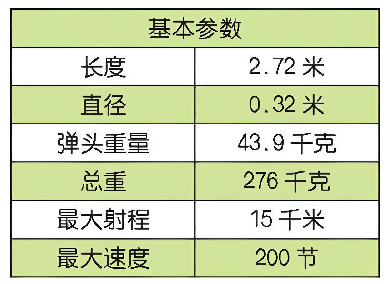 “暴风”鱼雷的水阻力很小,速度很快,大大超过普通鱼雷。该鱼雷战斗部装药为250千克,鱼雷尾部拖有制导导线,用来控制鱼雷的运动和引爆战斗部。