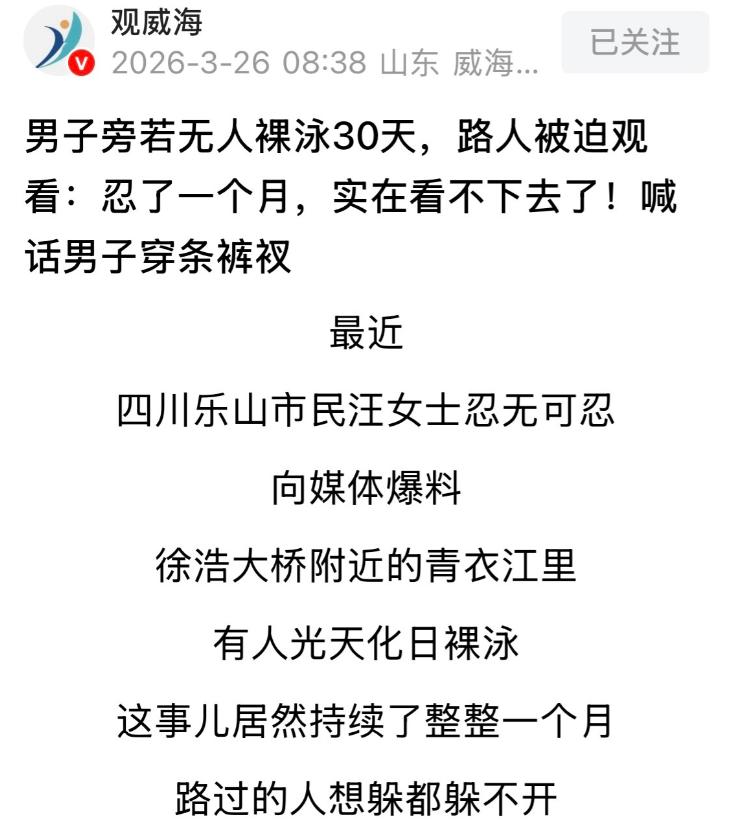 四川乐山,男子经常一丝不挂在江里裸泳,一女子每天散步时都能瞅见,看了整整1个月后,女子忍无可忍,直接曝光了男子的行为,指责他这样太不雅了,让孩子看到非常不好! 提到乐山,大家首先想到的是乐山大佛的庄严和峨眉山的秀丽,这座以山水闻名的城市,近来却被一件不雅事搅得沸沸扬扬。 不是什么惊天大案,却让不少市民直呼“辣眼睛”,甚至连路过的孩子都被无辜波及。 事情要从2026年2月底说起,家住徐浩大桥附近的汪女士,每天早上都有到青衣江边散步锻炼的习惯。 青衣江水质清澈、江风宜人,本是休闲放松的好地方,可从2月底开始,这份惬意被彻底打破。 汪女士每天到江边老位置,总能看到一个四五十岁的中年男子在江中游泳,起初她以为是对方忘带泳裤,临时应急。 可没想到,从2月底到3月25日,整整一个月,只要汪女士早上出现,这名男子就准时在江里,而且全程一丝不挂。 徐浩大桥下是妥妥的公共区域,每天晨练的老人、遛弯的居民、接送孩子上学的家长络绎不绝,根本不是什么“天体浴场”。 汪女士试过绕路避开,可绕路要多走半个多小时,实在不便;想上前提醒,面对光着身子的陌生人,又实在难以开口。 最让她揪心的不是自己的尴尬,而是路过的孩子,有一次她就看到一个五六岁的小男孩,指着江里的男子追问妈妈缘由。 孩子的妈妈满脸尴尬,支支吾吾说不出话,只能匆匆拉着孩子走开,这份无奈,很多路过的市民都感同身受。 3月25日,在连续“被迫观看”一个月后,汪女士终于忍无可忍,拍下男子裸泳的视频,联系媒体曝光。 她的诉求很简单:公共水域是大家共享的,凭什么成了某些人的“私人澡堂”? 视频一经发出,立刻在乐山本地引发热议,网友评论两极分化,但大多人都站在汪女士这边。 有人调侃两人“一个按时游,一个按时看”,但更多人直言,这种行为太自私、太没公德心,完全不顾及他人感受。 记者随后赶到徐浩大桥下核实,发现现场情况和汪女士描述的一致,江边不少人规范游泳,唯独这名男子我行我素。 更让人意外的是,裸泳并非个例,有游泳爱好者透露,附近小铜河一带也有不少裸泳者,大多集中在清晨时段。 有常来游泳的市民说,他们也劝过这些裸泳者,但对方根本不听,还振振有词说“又没让你看”。 甚至有裸泳者觉得,这是“老传统”,自己游了几十年都这样,现在没必要被苛责,可时代变了,规矩也得跟着变。 很多人觉得,裸泳顶多是不文明,算不上违法,这种想法其实大错特错,已经踩了法律的红线。 根据2025年修订、2026年1月1日起施行的《中华人民共和国治安管理处罚法》第四十四条规定, 在公共场所故意裸露身体,情节恶劣的,处五日以上十日以下拘留。 青衣江作为公共水域,属于明确的公共场所,而这名男子连续一个月在白天人流密集时段裸泳,完全符合“情节恶劣”的标准。 北京市中闻(西安)律师事务所的谭敏涛律师明确表示,该男子行为已涉嫌违法,公安机关有权介入处罚。 值得一提的是,乐山早在2026年2月5日就划定了乐山大佛遗产地部分水域为禁泳区,违者最高可罚300元。 这名男子不光裸泳不雅,其野泳行为本身,就已经违反了相关规定,可谓“双重违规”。 除了违法和不文明,裸泳背后的安全隐患更令人担忧,青衣江水流复杂、水温多变,裸泳者缺乏防护,极易发生抽筋、溺水。 每年夏天,各地因野泳引发的悲剧屡见不鲜,这些血的教训,本不该被忽视。 其实大家都懂,自由从来都不是无边界的,你的舒适不能建立在别人的尴尬之上,你的爱好也不能凌驾于法律和公序良俗之上。 一件小小的泳裤,守住的不只是个人体面,更是整个城市的文明底线,也是对他人的基本尊重。 目前,当地派出所已经关注到此事,明确表示会前往现场核实,后续也会出台相应管理措施。 汪女士的曝光,不是小题大做,而是对公共文明的勇敢捍卫,也提醒着大家,面对不文明行为,沉默解决不了问题。 乐山的老乡们,你们在青衣江、小铜河附近,还见过类似的裸泳行为吗? 对于这种连续一个月在公共水域裸泳的行为,你觉得该按法律顶格处罚,还是以劝导教育为主? 另外,你觉得相关部门该如何加强管理,杜绝这种不文明又违法的行为?欢迎在评论区留言,说出你的看法,一起为乐山的文明建设出出主意!