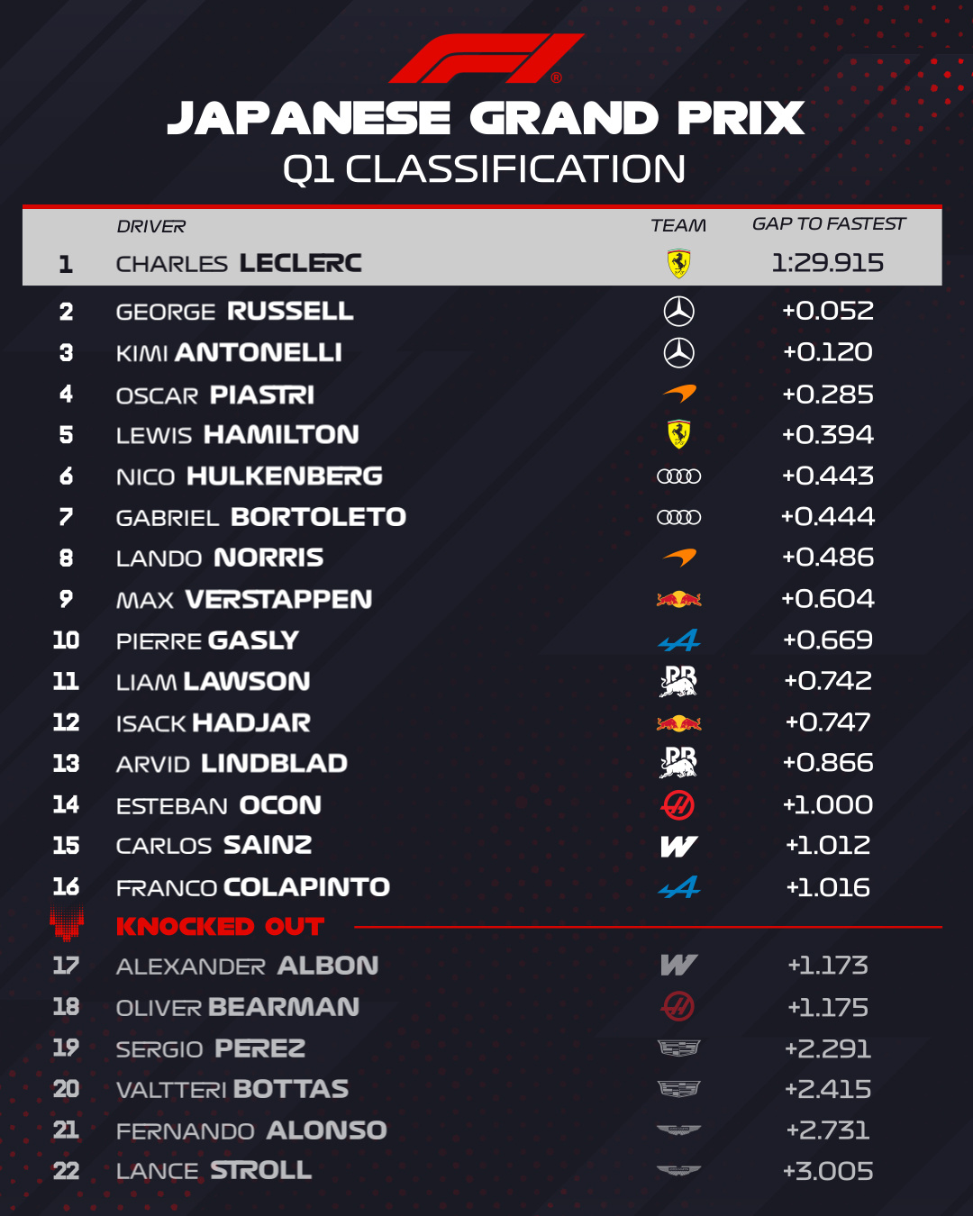 最终Q1淘汰:17: 阿尔本18: 贝尔曼 19: 佩雷斯20: 博塔斯21: 阿隆索22: 斯特罗尔