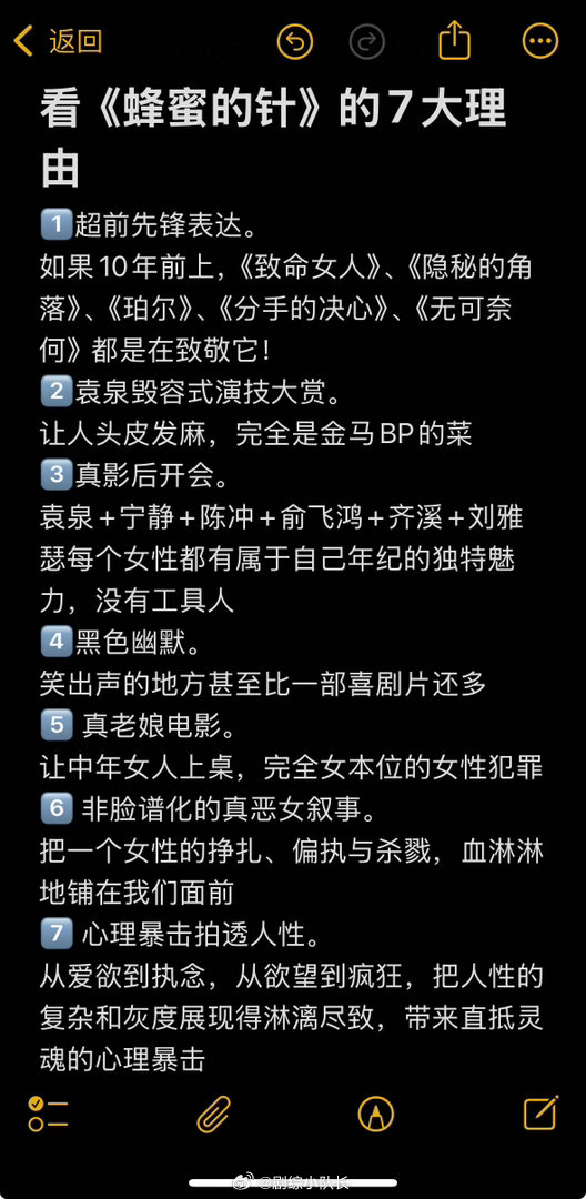 真正的老娘电影来了 《蜂蜜的针》里的女性,不是那种让人看了想抱抱的类型。她们让你害怕,让你战栗,让你想起自己不敢做的那一面。这种“娘味”,确实比哭哭啼啼高级太多了。