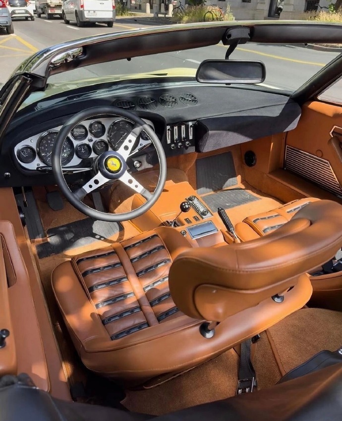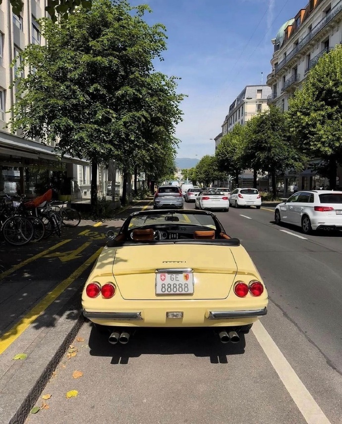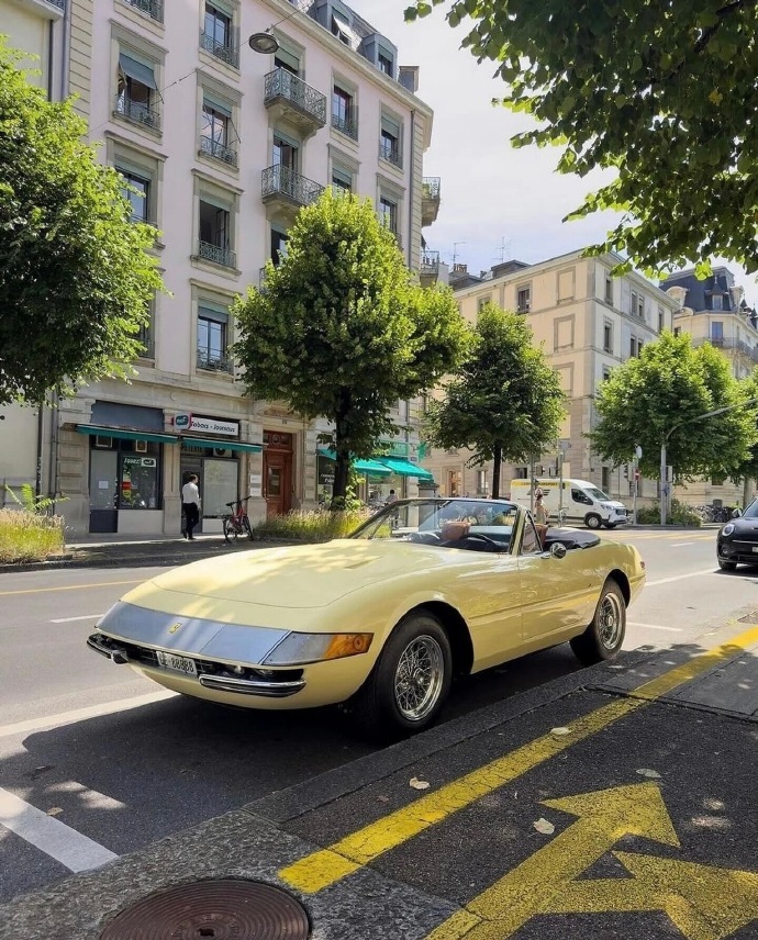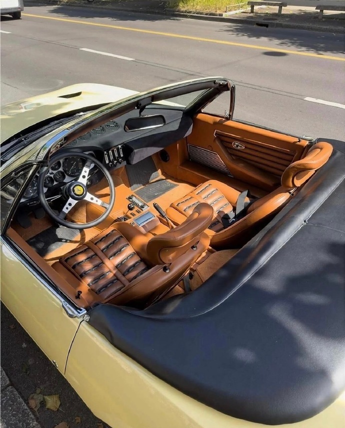 汽车 法拉利 365 GTS/4 Daytona Spyder!1973年法拉利 365 GTS/4 Daytona Spyder 是“大排量前中置V12”时代的绝唱,也是法拉利历史上最稀有的量产敞篷车之一。作为收官年份车型,它代表了这一经典设计的最终形态。全球仅 122台(另有说法为125台),1973年款属于最后批次,存世极少。4.4L Tipo 251 Colombo V12 自然吸气发动机,配6个韦伯化油器。352马力 7500rpm,极速 280km/h(0-100km/h约5.4秒)。5速手动变速箱位于后轴(Transaxle布局),实现48:52的前后配重。被誉为“最硬汉的敞篷法拉利”。