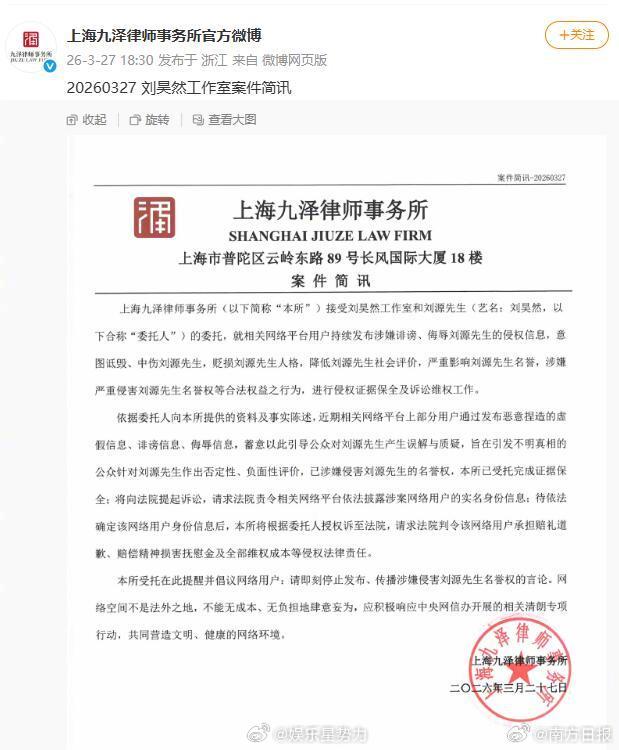 刘昊然批量告黑 刘昊然方委托律所3月27日发布公告,称部分用户恶意捏造虚假信息、