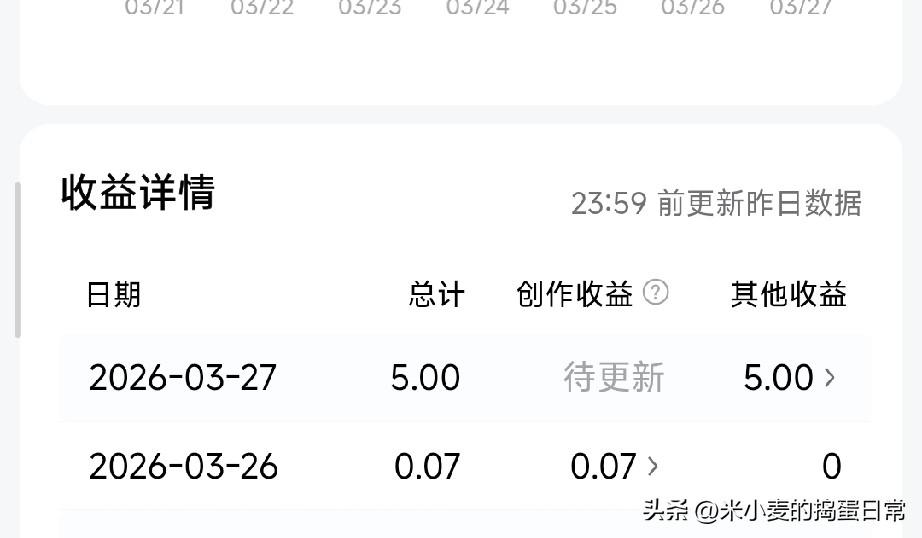 终于收到第一笔活动奖金了! 做今日头条活动,每天几分钱的收益看得我都快麻木了,昨天还在吐槽“这收益连买瓶矿泉水都不够”,结果今天一打开APP,直接弹出系统通知——「头条创作训练营」第四期的5块钱活动奖金到账了! 说实话,之前为了凑任务,又是写笔记又是发观点,还踩过一次坑(观点任务没达标失败了),一度觉得这平台对新人太不友好了。没想到坚持发优质内容,真的能被看见。 看着收益明细里从0.05、0.07慢慢涨到今天的5块,突然就懂了:做自媒体哪有什么一夜暴富,都是靠一点点攒出来的。哪怕只是5块钱,也是对我这段时间熬夜写内容的肯定,比赚500块还开心。 也想跟所有刚起步的创作者说句心里话:别盯着眼前的几分钱泄气,只要内容够真诚、够优质,平台迟早会给你反馈。你们做头条多久了?第一次拿到活动奖金是多少?