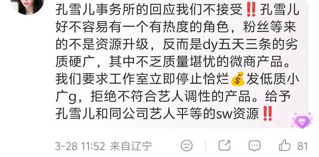 孔雪儿好不容易有所热度,粉丝就开始作妖,艺人能有推 广就不错了,这样折腾下去路人缘都给弄没了…