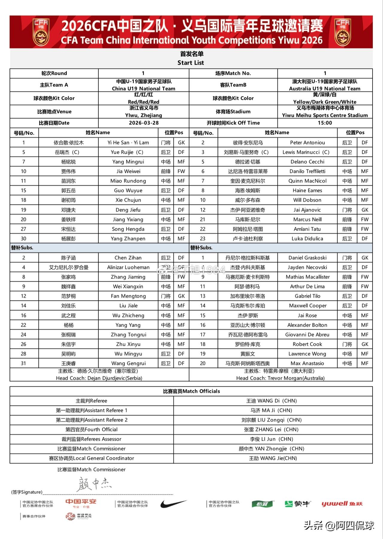 预测比分3:1,留洋球员魏祥鑫和张家鸣全部替补,久尔杰维奇有点浪费人才啊!义乌足球邀请赛,中国U19国青队对阵澳大利亚队热身赛的首发阵容出炉,留洋球员魏祥鑫和张家鸣全部坐在替补席。 前锋:贾伟伟 前腰:杨明锐 谢筠初 苗润东 后腰:姜轶祥 杨展彭 后卫:宋恒达 岳瑞杰 郭五岳 邓捷夫 门将:依合散 看来中国U19国青队留有后手。