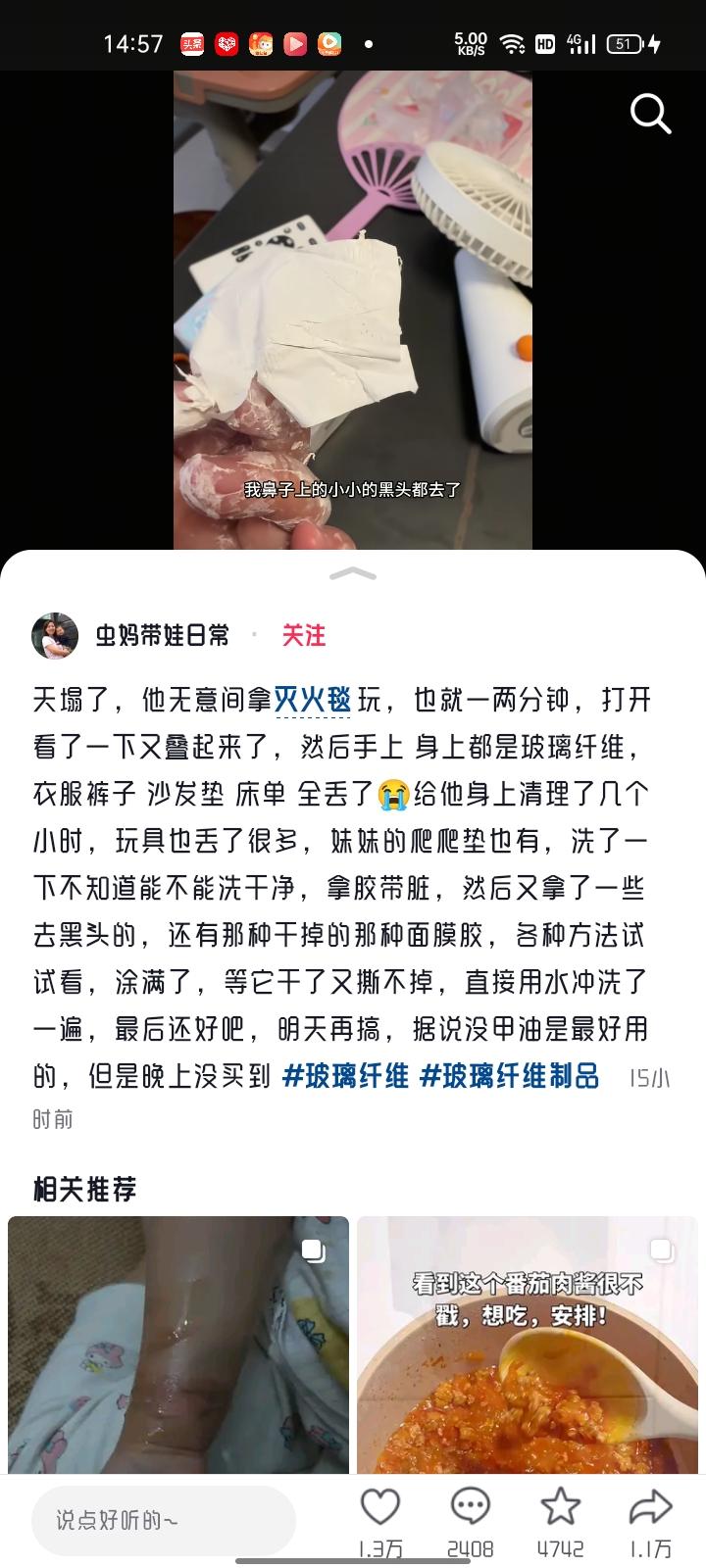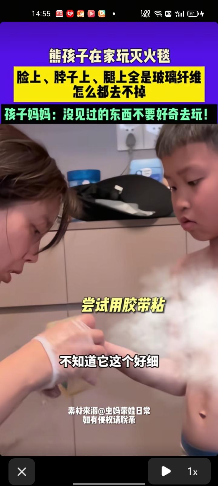 3月27日,广东深圳。熊孩子在家玩灭火毯,脸上、脖子上、手上沾满玻璃纤维,怎么都