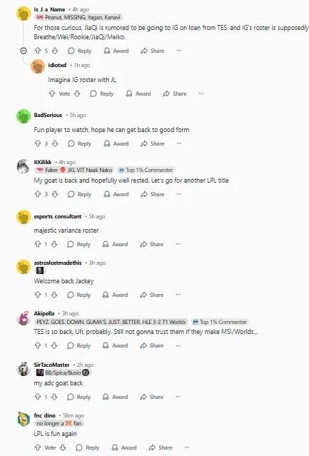 满足一下大家的好奇心,传闻JiaQi将从TES租借去IG,而且IG的阵容据说会是Breathe/Wei/Rookie/JiaQi/Meiko。