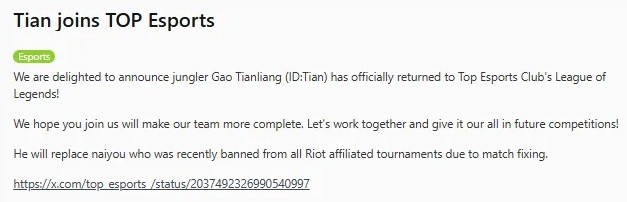 Tian加入TOPEsports