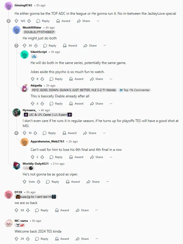 我甚至都不在乎他常规赛是不是在疯狂送,只要他在季后赛能支棱起来,TES冲击MSI还是很有机会的。