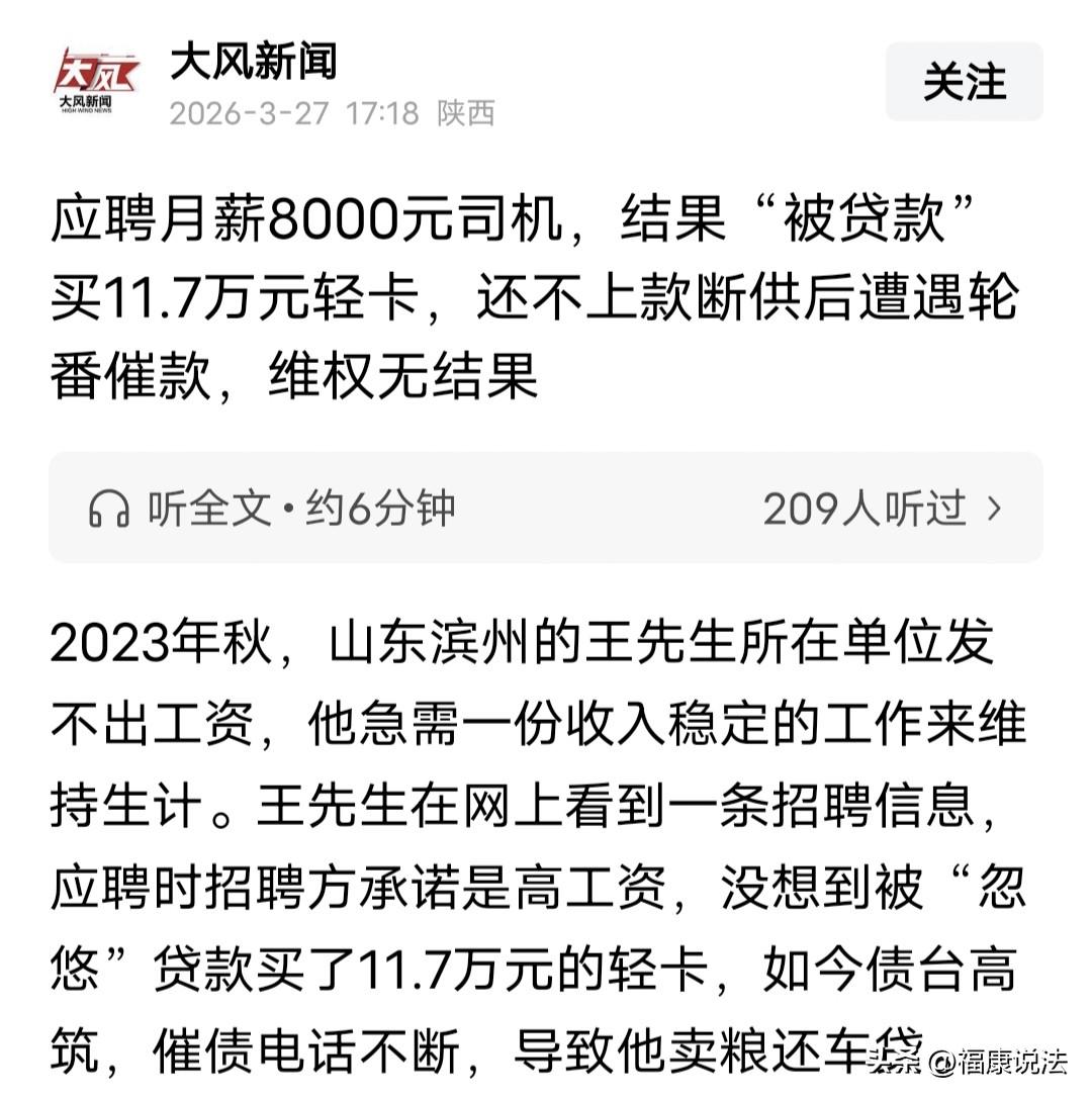 “坑人!”山东滨州,52岁男子单位停发工资,他为赚钱在网上应聘司机,月薪8000元,稀里糊涂被贷款买了11.7万的轻卡,他每月要还贷3548元,为了还款将家里玉米、小麦卖掉,勉强撑了一年,剩下7万多还不上,只能断供,却遭轮番催款轰炸,男子报警却无法立案,维权陷入困境。 2023年秋天,52岁的王先生日子过得特别难。原来上班的单位发不出工资,他成了没收入的人,家里老小都得吃饭,他急得像热锅上蚂蚁,满脑子就想赶紧找份稳当工作挣钱养家。 就在这时,他刷到网上一家物流公司的司机招聘,眼睛瞬间亮了。 岗位写得明明白白:月薪8000块,干满一个月就交五险一金,还有固定货源,只跑济南到滨州一条线,不用东奔西跑找活干。王先生觉得这简直是为他量身定做的,立马投了简历。 没几天,公司就联系他去面试。2023年11月,王先生揣着希望赶过去,面试的女工作人员一开口就问:“你有自己的货车不?”王先生老实巴交,直说没有——他要是有钱买车,也不至于急着找工作。 工作人员立马忽悠他:“自己有车的话,挣得更多,一个月一万块轻松到手。” 王先生当时满脑子都是挣钱养家,压根没多想,就信了这话。 接着,工作人员写了段话,让王先生照着念,还拿手机给他录视频。王先生以为这是正常入职流程,让做就做,没半点防备。录完视频,对方还收走他的身份证,说要走审核流程,让他回家等消息。 等了好几天,王先生接到通知,让他去济南。 他以为是去办入职、正式上班,兴冲冲赶过去,结果压根不提工作的事,眼前直接摆着一辆轻卡车。 工作人员让他把车开回家,先练练手熟悉车况。 王先生越想越不对劲,过了几天赶紧问上班时间,对方却甩给他一个电话号码,说不负责安排工作,想拉活就自己联系调度,然后就没了下文。 王先生没辙,只能联系调度硬着头皮跑活。 前两趟还好,跑下来收入少得可怜,根本达不到八千块的标准。 他不甘心,又按调度安排去德州拉小零食,结果这一趟更惨,挣的钱连油钱都不够,纯亏本。 直到这时候,王先生才彻底反应过来:自己根本没找到工作,反倒被人一步步套进去,稀里糊涂贷了款,买了一辆11.7万的轻卡车。这车首付44820元,剩下的分36期还,每个月要还3548.42元,车还在他自己名下。 他发现被骗后,去找公司维权,折腾半天只拿到5000块补偿,还被迫签了字,承诺不再追究责任。 没了办法,王先生只能自己在货运平台接单跑车,挣的钱连车贷都不够,更别说油费、保险、修车钱。 为了凑钱还款,他把家里种的玉米、小麦全卖了,就这么硬撑着还了14期车贷,从2023年12月一直撑到2025年1月。 到最后,家里粮食全卖光了,再也拿不出一分钱,剩下7万多贷款根本还不上,只能被迫断供。 断供后,王先生的噩梦彻底来了。催款电话、带侮辱性的辱骂短信轮番轰炸,他天天被搅得吃不好睡不好,心里又气又委屈。 后来有好心工友提醒他,这就是专门坑人的“套路运”,让他赶紧报警。 王先生这才醒悟,2024年6月报了警,盼着警方帮忙讨公道。 2025年3月,警方给出答复:因为贷款时有王先生的视频、人脸识别,还签过免责协议,属于经济纠纷,没法立案,只能去法院起诉。 更无奈的是,这家物流公司早在2024年5月就倒闭了,当初的工作人员也早离职了。 王先生想退车退款,彻底没了门路,只能自己扛着这笔巨债,还要承受无休止的催收,这真的太难熬了。 有人说,我就差一点就上当了,物流公司招司机,我去应聘,工作人员引导我购车加入,同配置,同级别的车市场上落地不到十二万,他们的车要十八万,公司包油包牌包货源,包每天最低收入四百,净收入,不够公司补。后来想想,去应聘是为了挣钱,为啥掏钱买车呢?他们说的天花乱坠也不可能掏钱。 从法律方面怎么看这件事呢? 《民法典》第148条规定:一方以欺诈手段,使对方在违背真实意思的情况下实施的民事法律行为,受欺诈方有权请求人民法院或者仲裁机构予以撤销。 物流公司用“月薪8000、五险一金、固定货源”骗王先生来应聘,实际是诱导他贷款买车,属于民事欺诈。 王先生本来只想找司机工作,根本不想买车,是被忽悠才签的贷款、购车手续,违背真实意愿。 他可以拿着招聘信息、聊天记录、录音、催款短信等证据,去法院起诉,要求撤销合同、退车、返还已付的钱(首付+14期车贷),并让对方承担损失。 但有个风险,他签过《解除合同协议书》拿了5000元,对方可能主张他已放弃追责;不过如果她能证明这份协议也是被忽悠签的,仍有机会撤销。