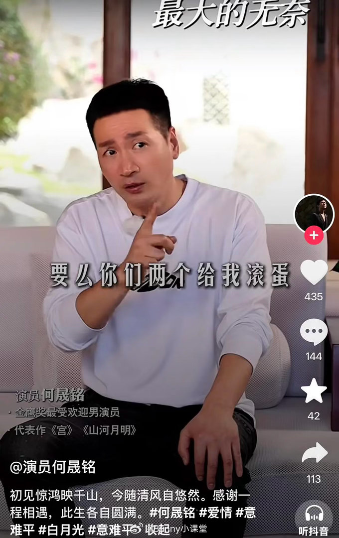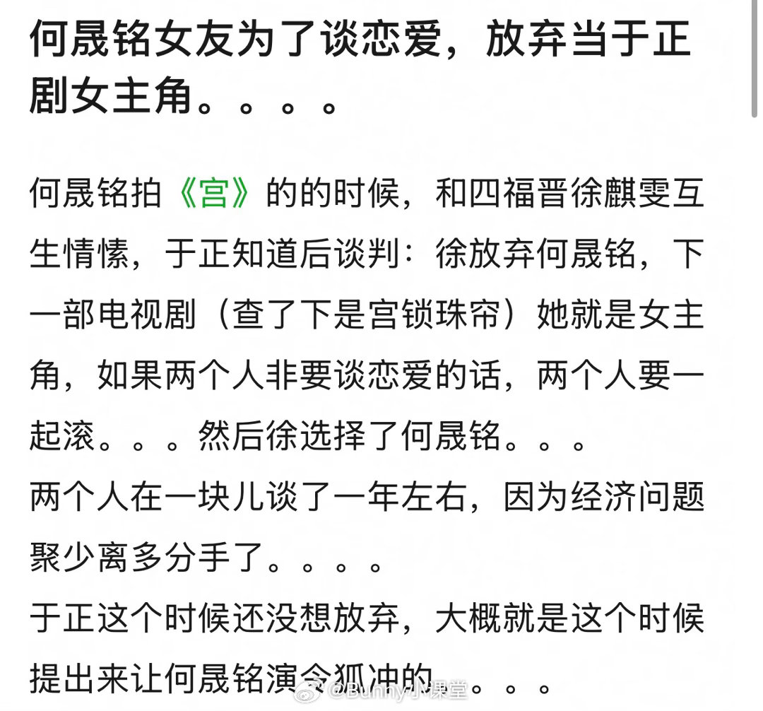 何晟铭自曝拍《宫》的时侯,和四福晋扮演者徐麒雯互生情愫被于正棒打鸳鸯,如果徐麒雯放弃何晟铭就能做下部戏的女主角,但徐麒雯还是选择了何晟铭……现在何晟铭重提此事,到底何意味