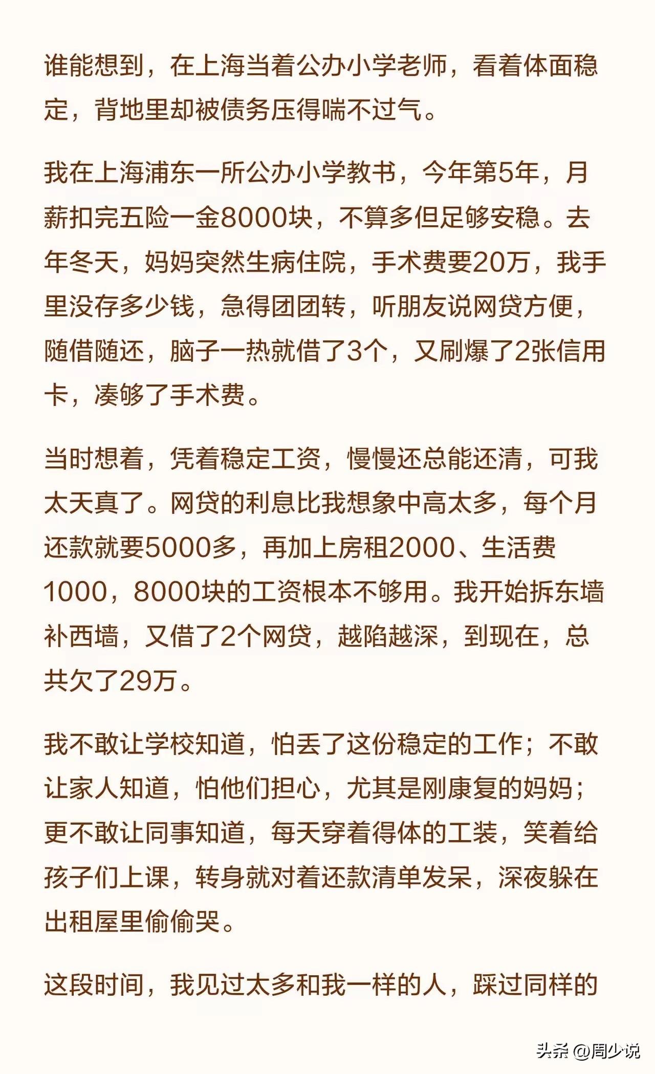 “网贷真是害死人!”上海浦东,一位从教5年的女老师,每月扣完五险一金到手8000元。去年冬天,母亲突然重病住院,20万手术费让她瞬间慌了神,手头没多少积蓄的她,听朋友说网贷放款快、随借随还,一时心急,一口气借了3家网贷,又刷爆2张信用卡,总算凑齐了医药费。 本想着靠着稳定工资慢慢还贷,没成想还是太单纯。网贷利息远超预期,每月光还款就占去5000多,再加上2000房租、1000生活费,8000块工资根本入不敷出。没办法,她只能拆东墙补西墙,又新增2笔网贷,一来二去,债务滚到29万。 怕丢工作、怕刚康复的妈妈忧心、怕同事议论,她每天穿着得体的工装,笑着给孩子们讲课,私下里却对着还款单发呆,深夜在出租屋偷偷抹泪,把所有压力都藏在心里。 此事传开后,网友们纷纷感慨:“太真实了,谁都有急用钱的时候,网贷真的碰不得”。 也有网友表示:“老师也是普通人,遇上急事真的没办法,希望她能慢慢熬过去”。 还有网友更是坦言:“看着体面的工作,扛不住突发的变故,千万不要盲目借网贷啊”。 其实,这位女老师的遭遇,在周少看来,绝非个例。生活里的突发状况总让人措手不及,可网贷看似是应急捷径,实则很容易让人陷入债务泥潭。我们总觉得稳定工作能兜底,可面对大额开支,仅凭一时冲动借贷,往往会让日子越发艰难。 心疼这位女教师的同时,也给所有人提醒,一定要远离网贷。同时提前做好储蓄规划、了解正规的应急筹款渠道,才是更稳妥的选择。#周少说教育# #寻美三湘#