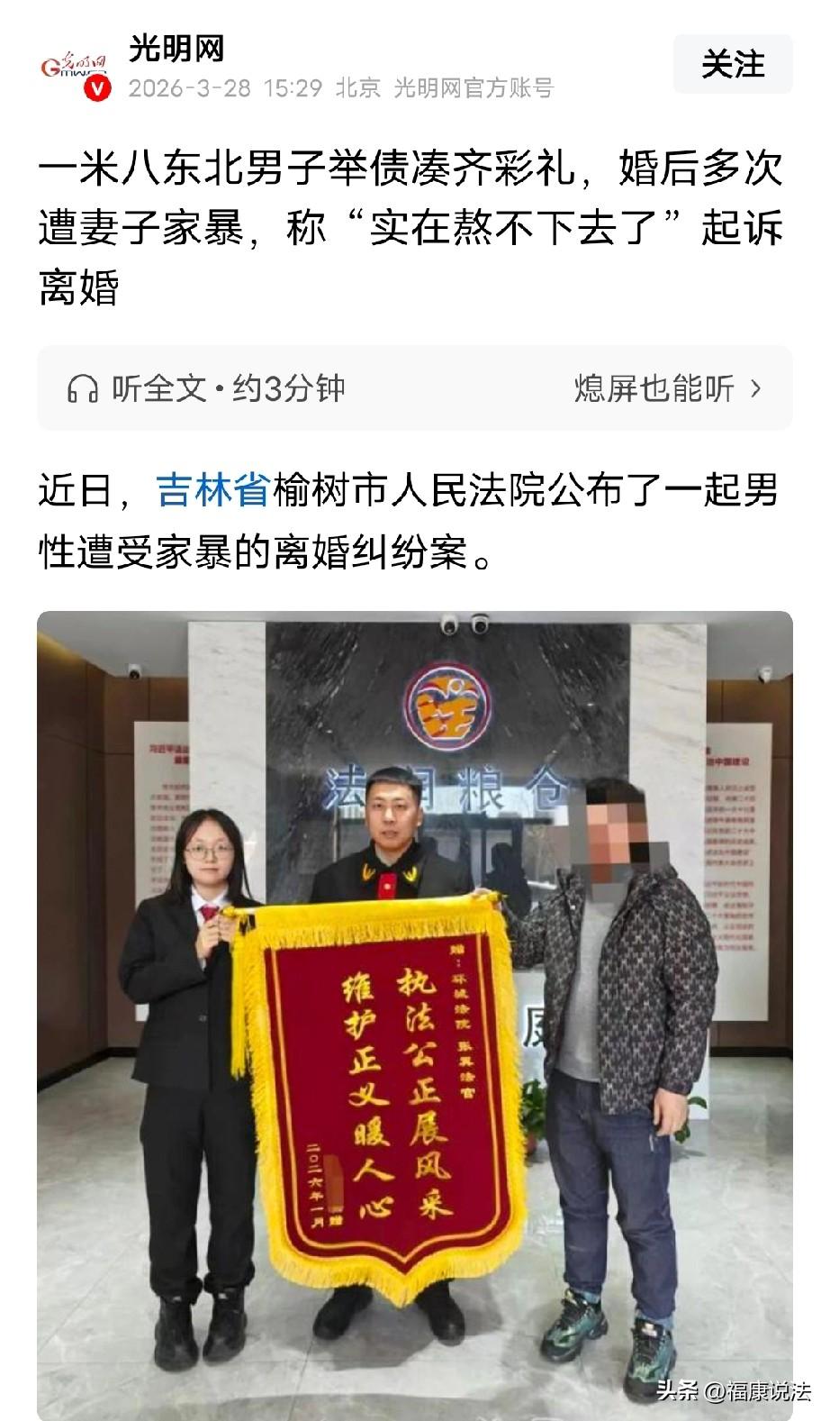 “太憋屈!”吉林榆树,男子身高1米8结婚才1个多月,妻子频繁家暴他,甚至持械威胁他,吓得他整日惶恐,提出离婚,不料,妻子拒绝离婚,拒绝返还彩礼,还出国一走了之,男子实在没招儿,拿着证据到法院起诉离婚,没想到,妻子态度嚣张,扬言自己在国外,谁也管不着,最终,法院这样判了。 齐先生,是个身高一米八的东北汉子,看着高大壮实,本该是家里的顶梁柱,可说起自己的婚姻,他在法庭上声音都止不住发抖,满眼都是委屈,说他真的熬不住了…… 原来,齐先生和王女士认识了半年,相处得挺好,女方看着性格温和,两人也挺有好感的,没多久就商量着结婚。 结婚本是喜事,可对齐先生来说,却是压力的开始。 为了凑够彩礼,他家里条件一般,只能厚着脸皮跟亲戚朋友到处借,好不容易才把彩礼凑齐,风风光光把媳妇娶回了家。 谁能想到,婚前温柔的媳妇,婚后才一个多月,就性情大变。 王女士就像变了一个人,一点鸡毛蒜皮的小事,就能大发雷霆,不光动手打骂,还持械威胁他。 齐先生虽然个子再高,也不好意思对女人动手,只能一直忍着,天天活在害怕里,就怕妻子突然的爆发,日子过得憋屈又煎熬。 忍了很久,齐先生实在扛不住了,和王女士提出要离婚。 可王女士压根不同意,不仅不肯离婚,还说什么都不退还彩礼,最后干脆直接跑去国外,躲起来不露面,连沟通都不愿意。 齐先生这下彻底走投无路了,婚离不成,彩礼钱是借的外债,天天被人催债,自己还天天受着委屈、受着气。 他实在没办法,整理好自己被打伤的照片、报警的回执、医院开的诊断证明,攥着这些证据,跑到法院起诉离婚,见到法官就忍不住说:“我实在熬不下去了,求求帮我离婚。” 法院受理案子后,联系远在国外的王女士。 不料,一开始王女士态度特别差,不仅不配合,还破口大骂:我没错。甚至嚣张地说自己在国外,谁也管不着,有本事来抓我。 法院这边的工作人员耐心又严肃地跟她讲法律,告诉她家暴是违法的,不管在哪都要担责任。 首先,家暴不分性别,女方动手打男方、持械威胁,已经属于违法行为,法院碰到这种情况,调解没用的话,必须判离婚,这是法律明确规定的。 其次,齐先生的彩礼是借外债凑的,结婚才一个多月就闹离婚,共同生活时间极短,这笔彩礼直接导致他生活困难、背负巨债,完全符合法律里彩礼返还的条件。 最终,经过法院调解,齐先生和王女士正式离婚,王女士一次性返还大部分彩礼。 本案中,女方存在家暴过错,法院判决女方返还大部分彩礼,既合法又合理,并不是男方无理取闹。 如果,王女士要是一直不配合,法院会冻结她的财产,把她列入失信名单,限制高消费,以后回国、生活都会受大影响。 而且,齐先生和王女士结婚时间特别短,生活的时间也短,彩礼是男方借债凑的,女方还家暴,于情于理都该退大部分彩礼。 最后,齐先生这场憋屈的婚姻总算结束了。 一说起家暴,大家第一反应会觉得受害的都是女性,可这件事也让大家看到,男性也会遭遇家暴。 不管是男是女,动手打人、威胁恐吓都是错的,都是违法行为,不能因为是女性家暴,就觉得没事,也不能因为男方个子高,就说他活该。 只要遭受家暴,就该勇敢站出来维权。 另外,举债结婚要谨慎,别为了面子掏空自己。 齐先生为了结婚,借遍亲友凑彩礼,本以为是幸福的开始,结果换来一场伤害,还背上一身外债。 现在很多人结婚,彩礼钱要得高,超出自身能力,宁愿举债也要结婚,其实特别不理智。结婚是过日子,不是拼面子,量力而行才是最实在的。 最后提醒单身人士,谈恋爱的时候,别只看表面,多相处、多了解,看清对方的真实脾气和人品,别仓促结婚。 要是发现对方性格极端、情绪不稳定,一定要及时止损,别等到结婚后才后悔。 最后想说,婚姻是相互尊重、相互体谅的,不是一方欺负另一方。 不管男女,都要守住底线,别动手伤人,也别在婚姻里委屈自己,遇到错的人,及时离开才是最好的选择。