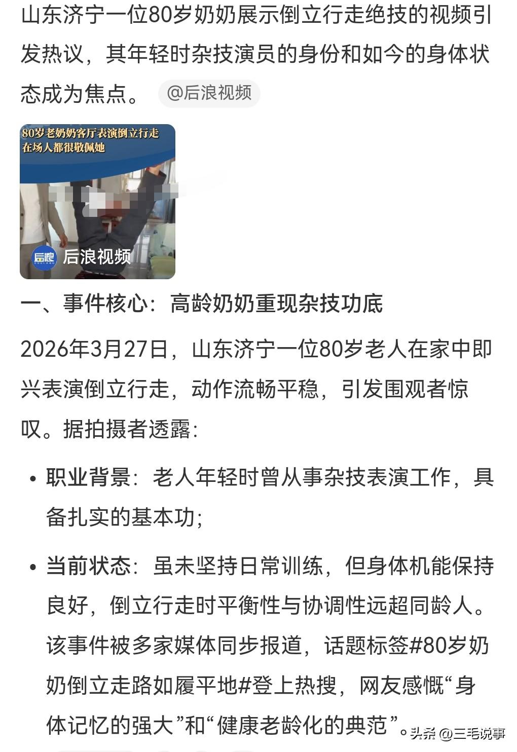 这真是活久见啊,想不到还有这么厉害的人,80岁老奶奶竟然还能够倒立。 这真是不得不服啊。 3月28日热搜,80岁奶奶倒立走路如履平地。 原来这名老人年轻的时候是一名杂技演员,想不到这么久过去了,她的功力依然健在呀。 老奶奶这臂力真的是远超同龄人了。 虽然老奶奶非常的厉害,但是还是要注意安全,量力而行啊。
