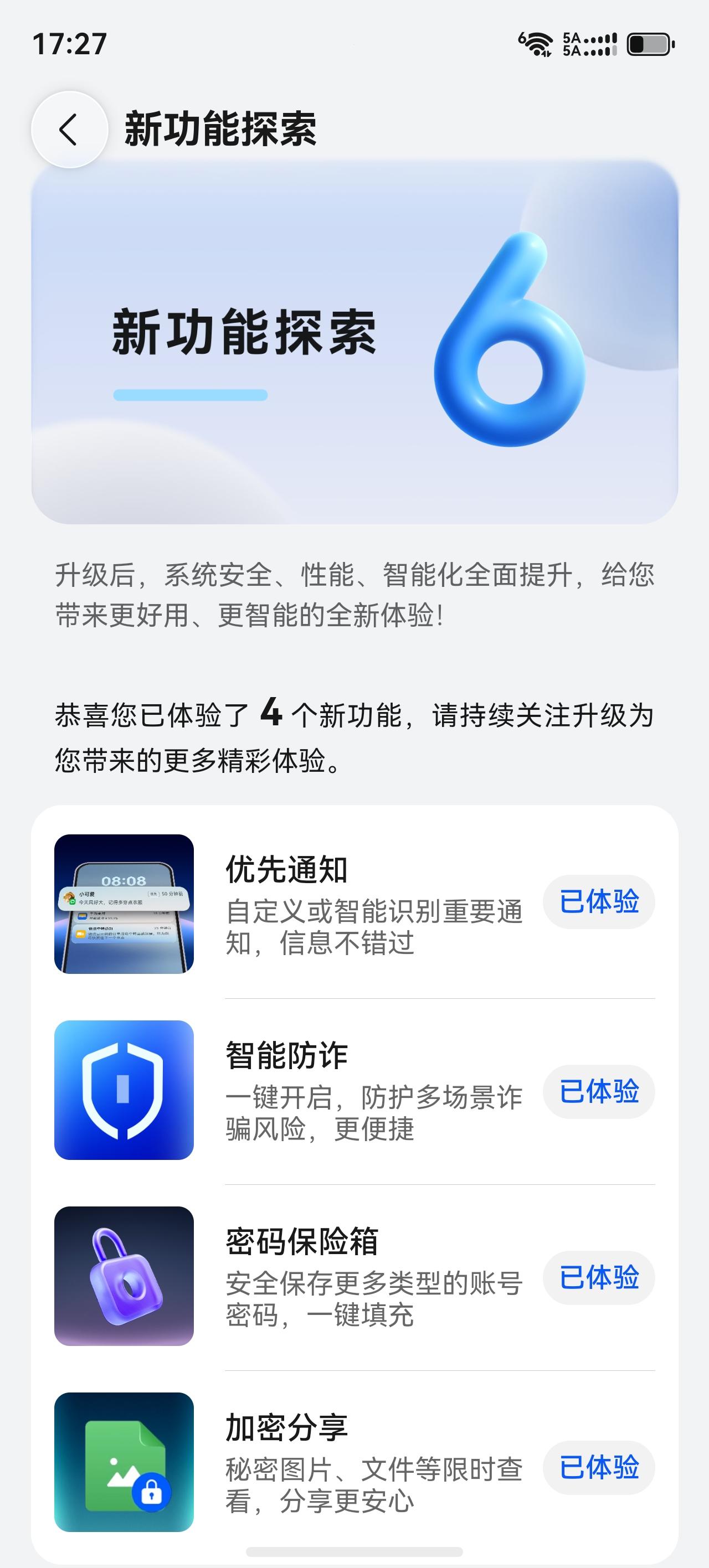 惊喜来袭!鸿蒙6.0.0.328SP52更新完系统更好用了! 今天收到鸿蒙最新版本6.0.0.328SP52更新提示,果断更新了。一共增加了四个新功能,优先通知,智能防诈,密码保护箱和加密分享。除此之外带来了全新的沉浸光感效果,更新后默认是开启的。带来全新的体验,确实值得更新!