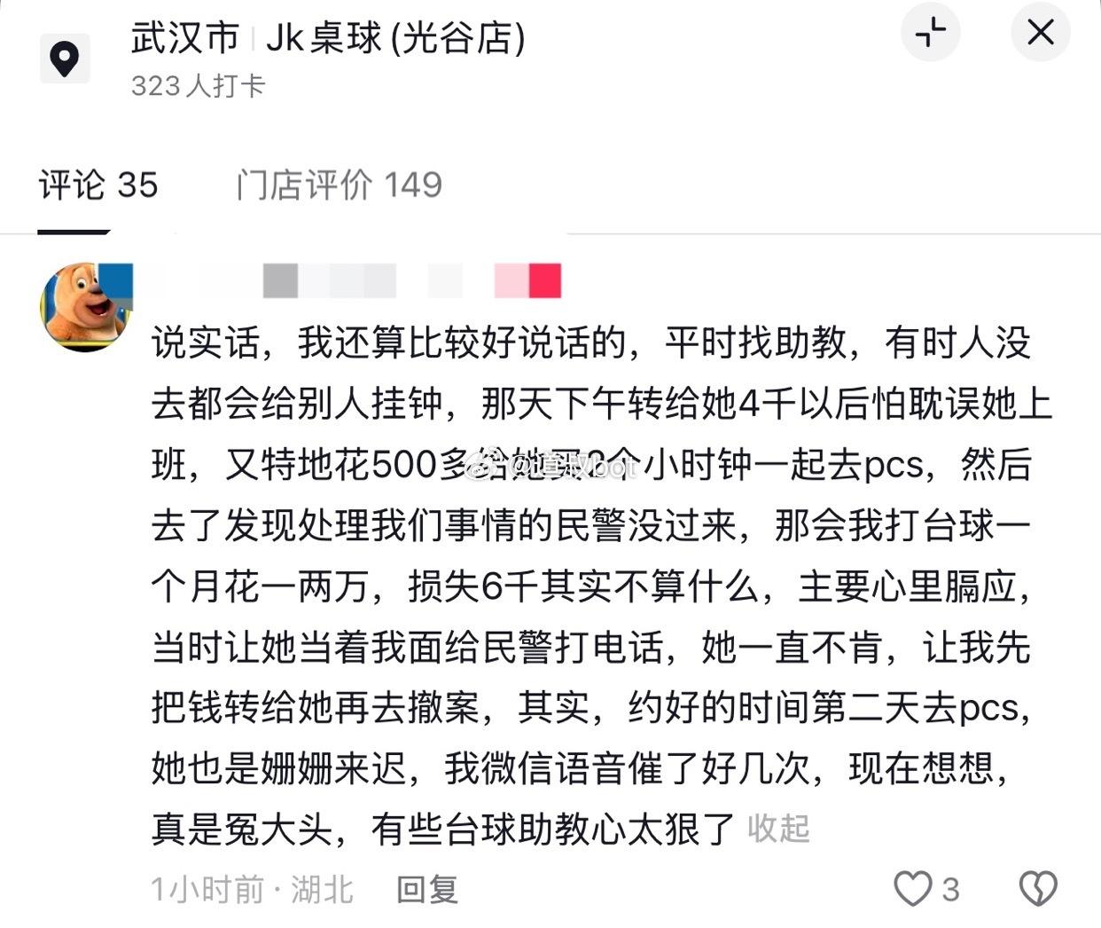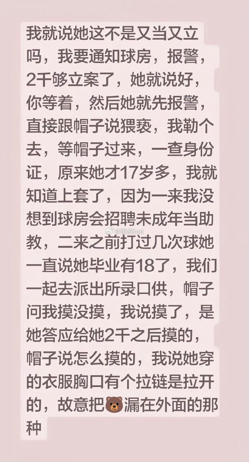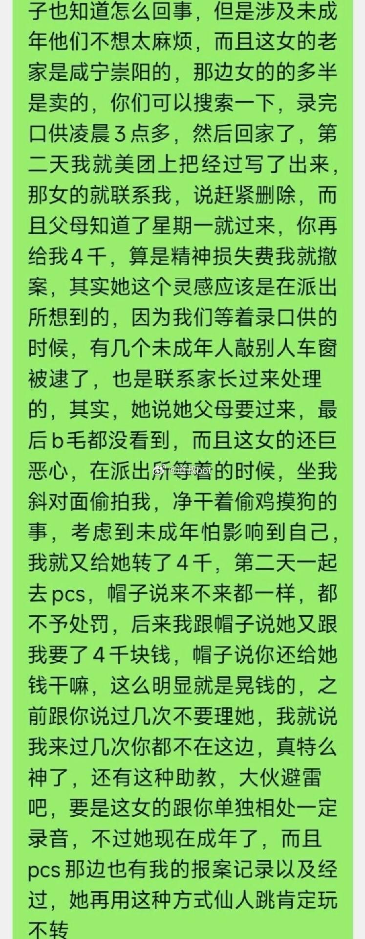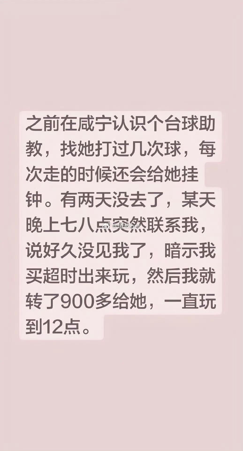 湖北咸宁男子遭遇台球助教仙人跳,损失 6000 块。男子经常去咸宁某台球厅打台球,和一名助教熟悉了,每次都帮他挂钟。因为好多天不去,这名助助教发微信给他说好久不见了。于是这名男子又跑去,并给他充了 900 块挂钟,约女子出去看电影。 这名女子暗示可以可以摸胸,男子那啥上脑了,信以为真,没想到男子正准备上手,女子就一把把他推开跑了。男子在微信上面质疑女子,刚刚不是说给了钱就可以吗?你这不是在玩逗我吗?女子说,想不到你是这样子的人,以后不要联系。 男子很生气,就威胁要向台球厅投诉,报警。没想到女子硬刚,直接报警,到了派出所。一查身份证,男子傻眼了,女子才 17 岁。但是警察有经验,知道女子不是善茬。做了笔录以后就让男子回家了,案子没销。 女子后面在微信上面和男子谈判,说给他 4000 块精神损失费,他就去销案。男子妥协了,又转了 4000 块给她,还充了 500 块给女子挂钟。后面他们一起去派出所销案。 男子和警察说给了 4000 块给女子作为精神损失费。警察大吃一惊,说你为什么还要给钱?都不用理她的,男子傻眼了。花钱买教训,不要去这种地方玩。这些女人就是吃准了男的好色,然后趁机玩仙人跳,敲诈男人的钱,还没处说理。