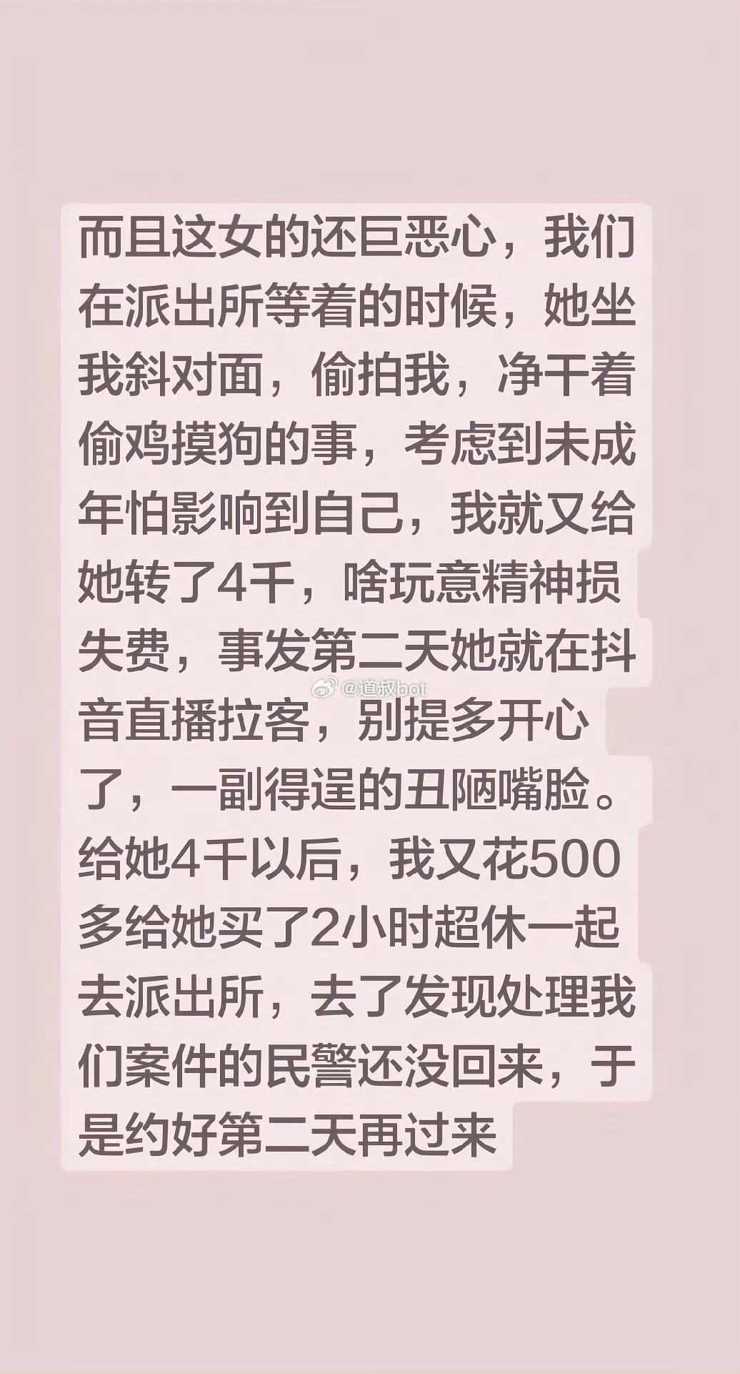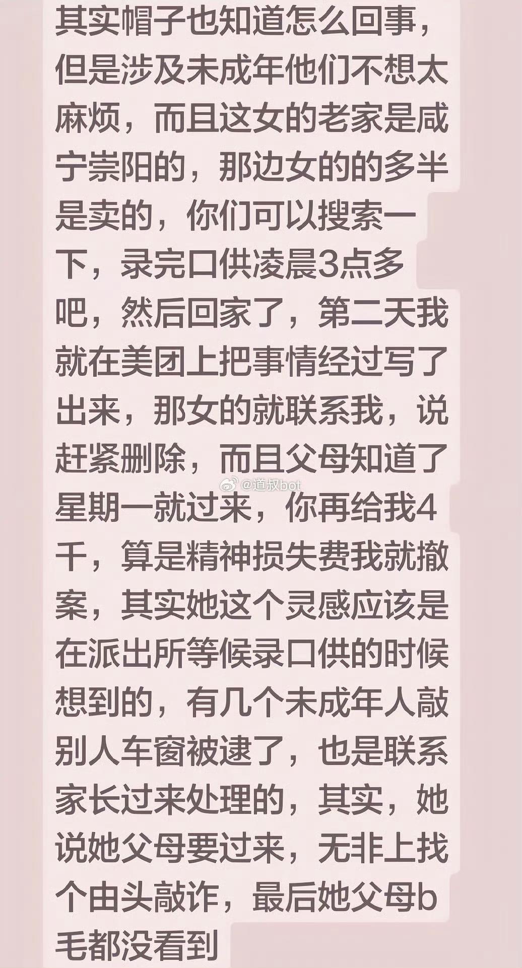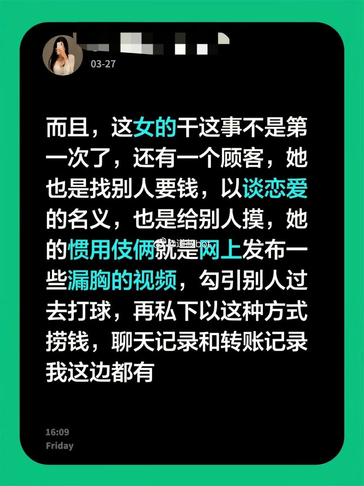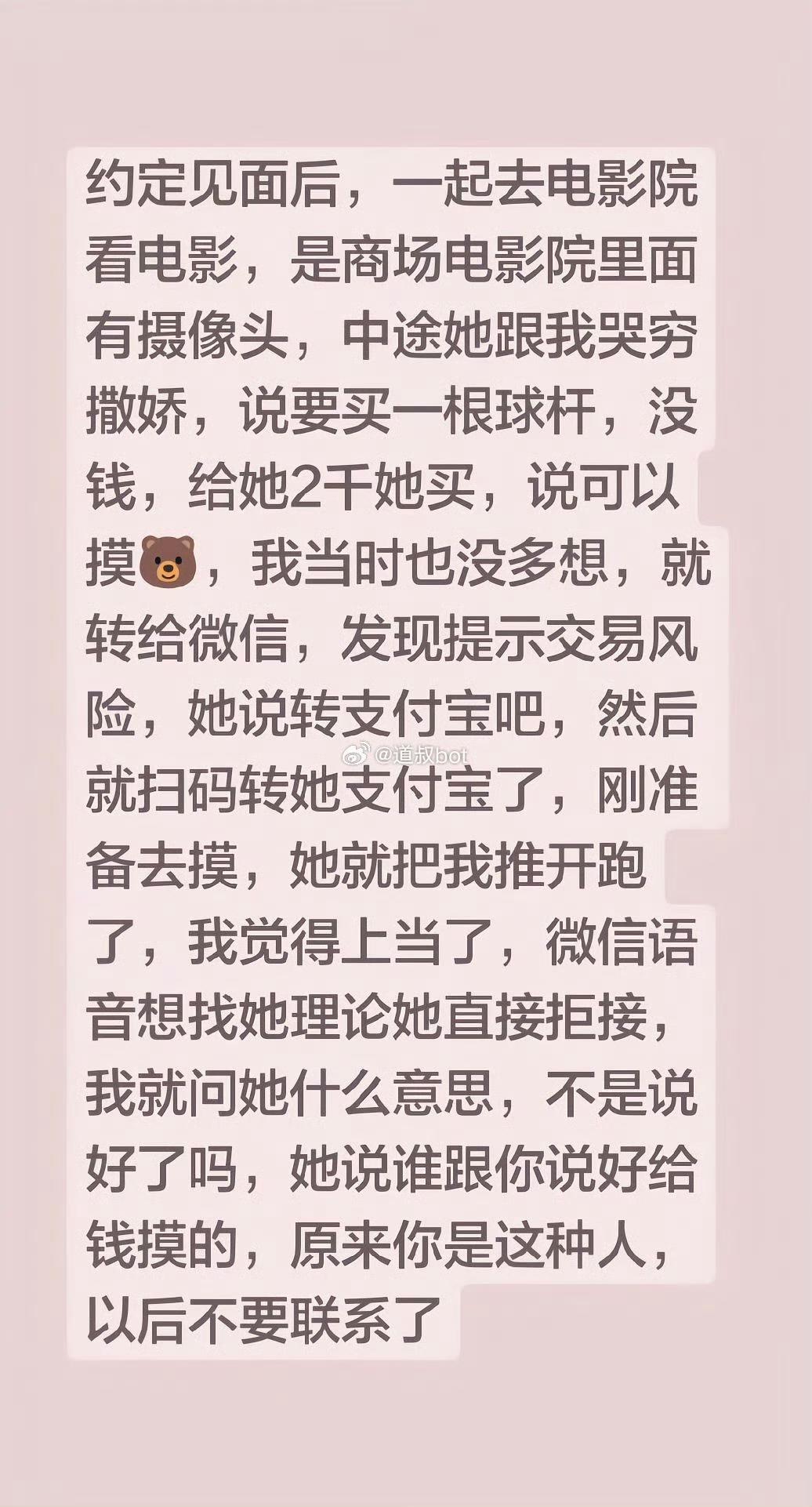 湖北咸宁男子遭遇台球助教仙人跳,损失 6000 块。男子经常去咸宁某台球厅打台球,和一名助教熟悉了,每次都帮他挂钟。因为好多天不去,这名助助教发微信给他说好久不见了。于是这名男子又跑去,并给他充了 900 块挂钟,约女子出去看电影。 这名女子暗示可以可以摸胸,男子那啥上脑了,信以为真,没想到男子正准备上手,女子就一把把他推开跑了。男子在微信上面质疑女子,刚刚不是说给了钱就可以吗?你这不是在玩逗我吗?女子说,想不到你是这样子的人,以后不要联系。 男子很生气,就威胁要向台球厅投诉,报警。没想到女子硬刚,直接报警,到了派出所。一查身份证,男子傻眼了,女子才 17 岁。但是警察有经验,知道女子不是善茬。做了笔录以后就让男子回家了,案子没销。 女子后面在微信上面和男子谈判,说给他 4000 块精神损失费,他就去销案。男子妥协了,又转了 4000 块给她,还充了 500 块给女子挂钟。后面他们一起去派出所销案。 男子和警察说给了 4000 块给女子作为精神损失费。警察大吃一惊,说你为什么还要给钱?都不用理她的,男子傻眼了。花钱买教训,不要去这种地方玩。这些女人就是吃准了男的好色,然后趁机玩仙人跳,敲诈男人的钱,还没处说理。