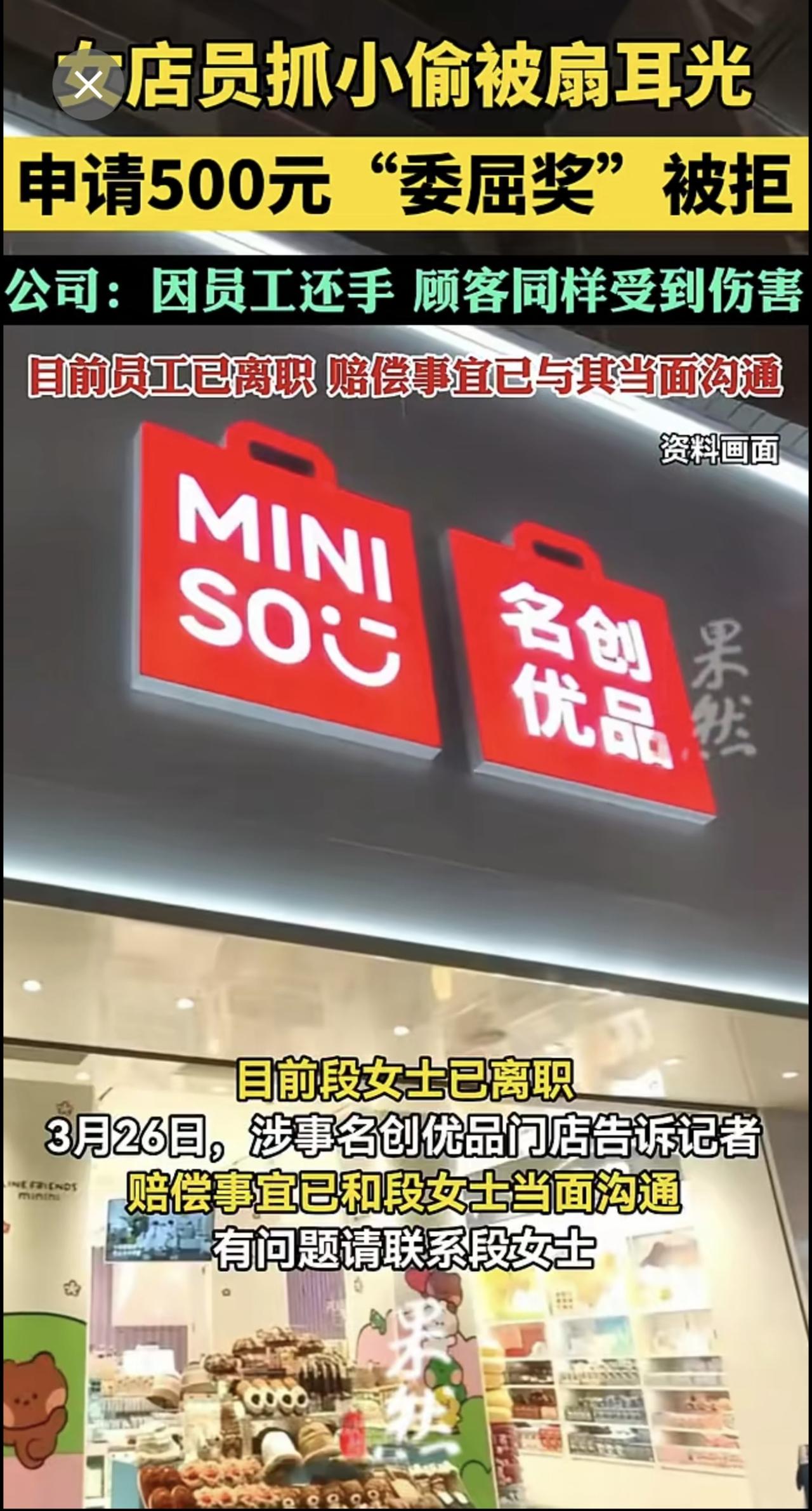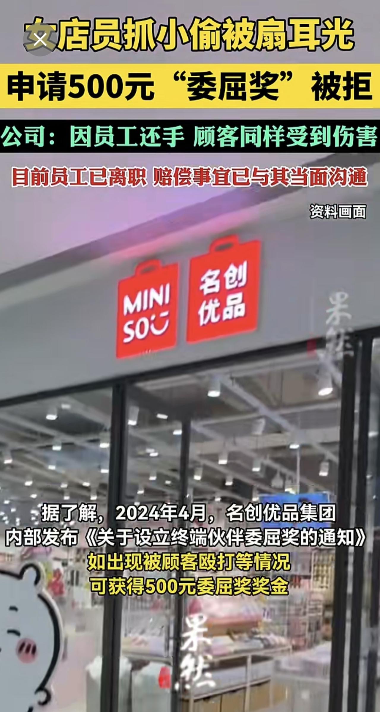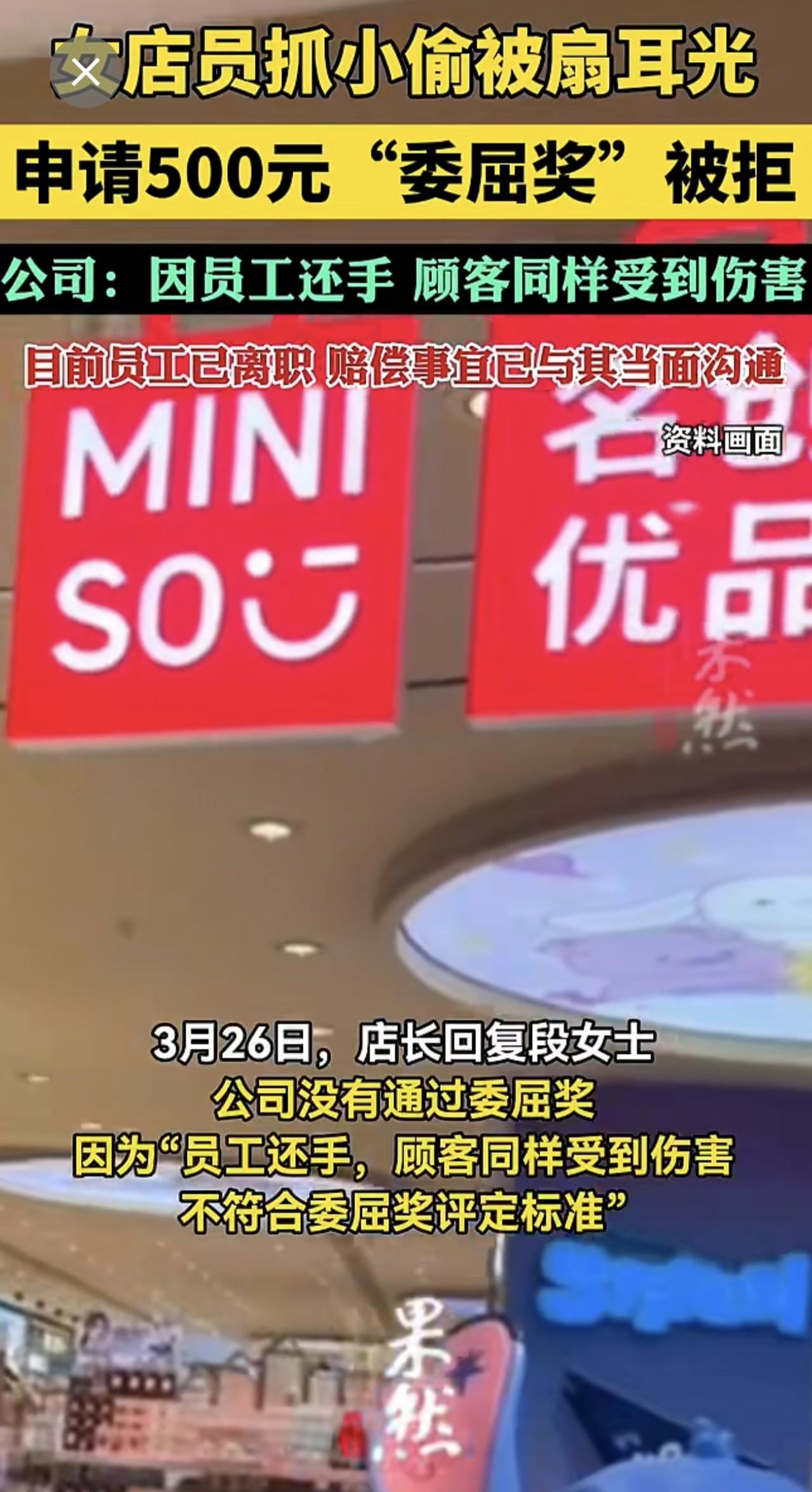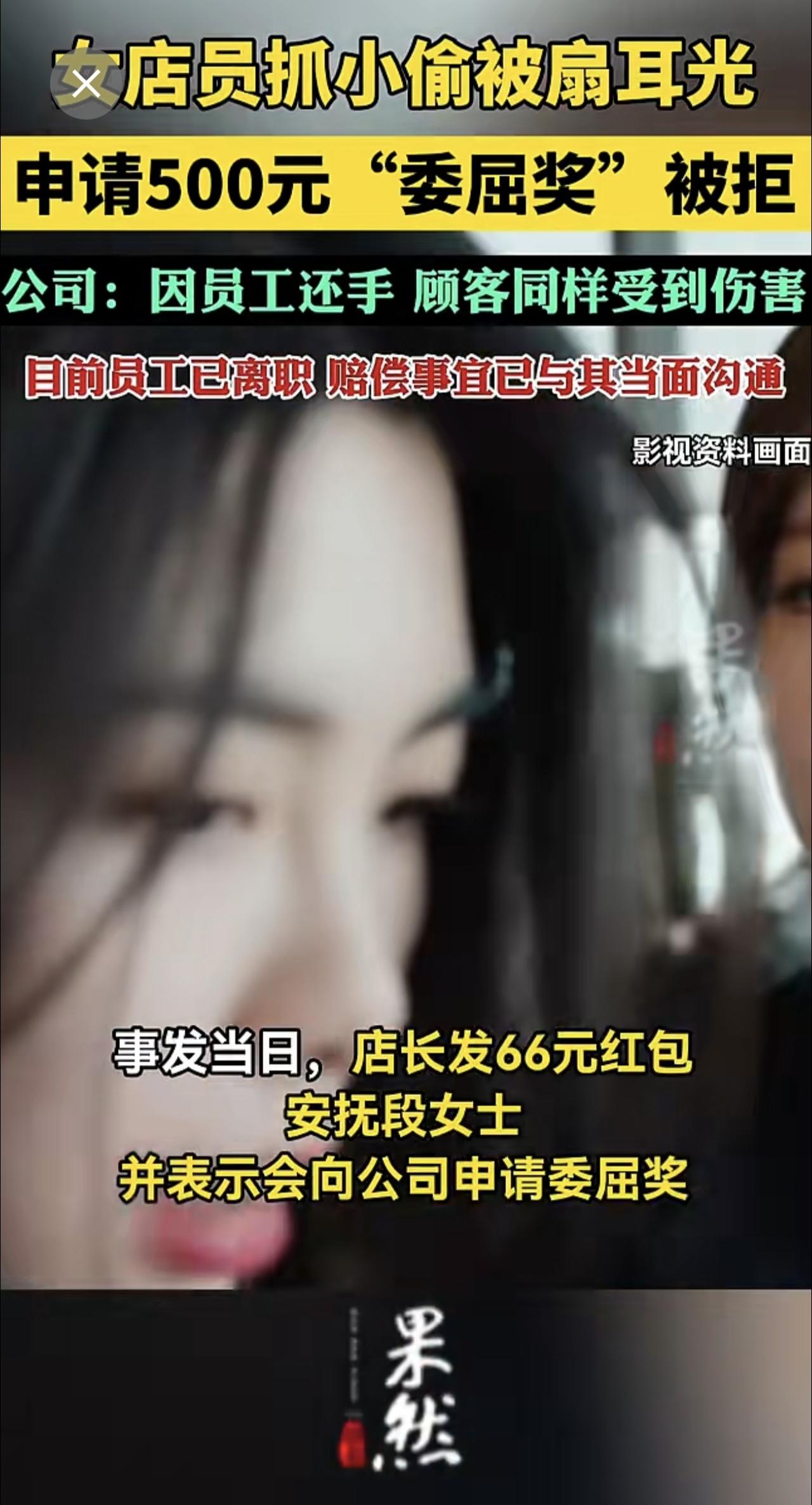 女店员抓小偷被扇耳光,申请500元“委屈奖”被拒,公司:因员工还手。