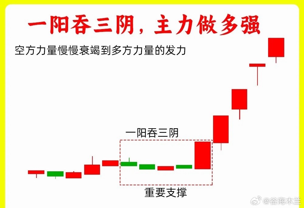 注意了!股价在底部一旦出现这四种形态,我会毫不犹豫关注一起,为什么这么说,往往趋势发生变化的时候,都会出现弱转强,强势洗盘,空头衰竭的形态。还是老规矩,点赞收藏或评论888支持一下,我每天分享炒股干货,以免以后想温习找不到了‘’一、三阴不吃阳股价在低位出现一根中大阳线,可能是涨停板,同时成交量出现放大,而次日,股价开始回调,小幅度的回调,,下跌幅度很小,出现这样三根阴线,股价都没有跌破前面的中大阳线,说明下方承接力量比较强,随后再次出现一根中大阳线,反包了前面的阴线,说明主力洗盘结束二、长阴加长阳股价在低位出现一个比较长的阴线,快速跌破下方支撑位,形成破位下跌。次日出现一个中大阳线,反包了前面阴线。同时成交量出现放大,形成股价和成交量的双重覆盖。快速反包,如果是小阳线,那就有可能股价是真下跌了三、一阳吞三阴股价在低位横盘整理或是在下跌趋势的末期,有连续三根阴线,一般是阴跌,跌幅很小,随后出现一根中大阳线,一次性反包了三根阴线,说明多方力量开始放量,比较强势,阳线越大就越强。当然了这个走势如果是高位出现,那就要小心了,一定是底部出现四、 大阳穿三线这个说的三线,就是我们常用五日均线、十日均线和二十日均线,股价在低位运行,多条均线开始相互粘合,说明股价长期横盘过程里,随后出现一个大阳线,,一次性突破了三根均线,并且有效站稳,影线突破不算,要实体突破。好了!以上就是四种底部形态的全部内容。如果还有什么问题,可以留言告诉我。希望对大家有启发,也是最为基础的内容,一定吃透。我们下期内容再见
