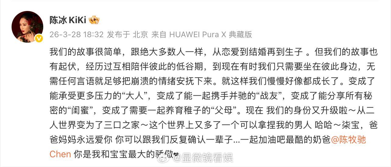 陈牧驰陈冰官宣结婚生子陈牧驰感谢陈冰陪伴自己陈牧驰今天发的长文里,有对过往的坦诚,也有对当下的珍惜。陈牧驰坦然面对自己曾在艰难时期将坏情绪留给陈冰的愧疚,也真诚感谢了对方的包容。感谢粉丝支持的同时,也许下承诺会继续用角色证明自己,在这篇长文里看见了一个更立体、更真实的陈牧驰!