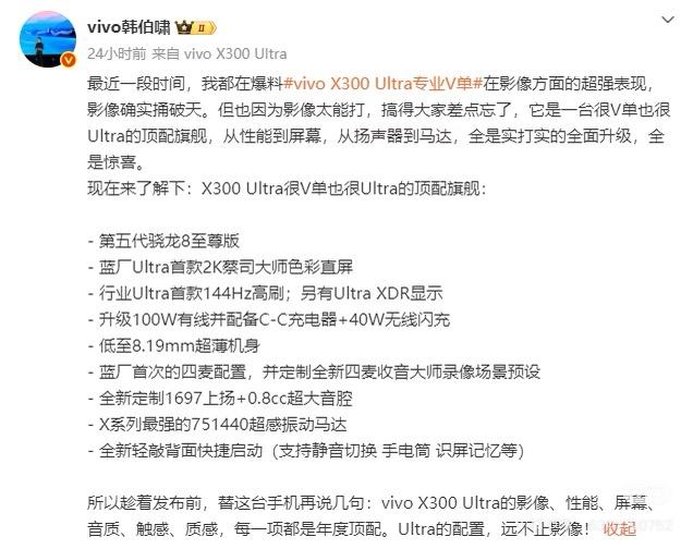 vivo X300 Ultra 要炸场了! vivo 这次真的把「Ultra」玩明白了✨ 第五代骁龙 8 至尊版 + 2K 蔡司大师直屏,性能和视觉双在线;144Hz Ultra XDR 显示,刷剧游戏丝滑到飞起~机身薄至 8.19mm,手感轻盈又高级! 100W 有线 + 40W 无线闪充,续航焦虑直接拜拜,还有定制 1697 上扬扬声器、751440 超感振动马达,影音体验拉满! 更绝的是摄影师套装!外接镜头 + 专业配件,手机秒变专业相机,随手出片不是梦🥹 颜值能打、性能能扛、影像能打,这波 vivo X300 Ultra 我先冲为敬!坐等发布!