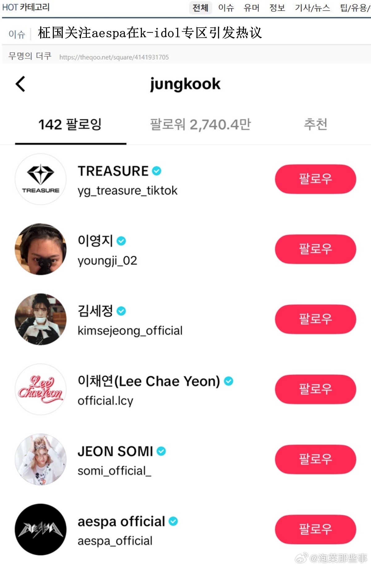 🔥🔥韩网600楼热帖评论翻译🔥🔥田柾国关注aespaBTS田柾国Tiktok关注aespa在韩网论坛引发热议。cr.theqoo