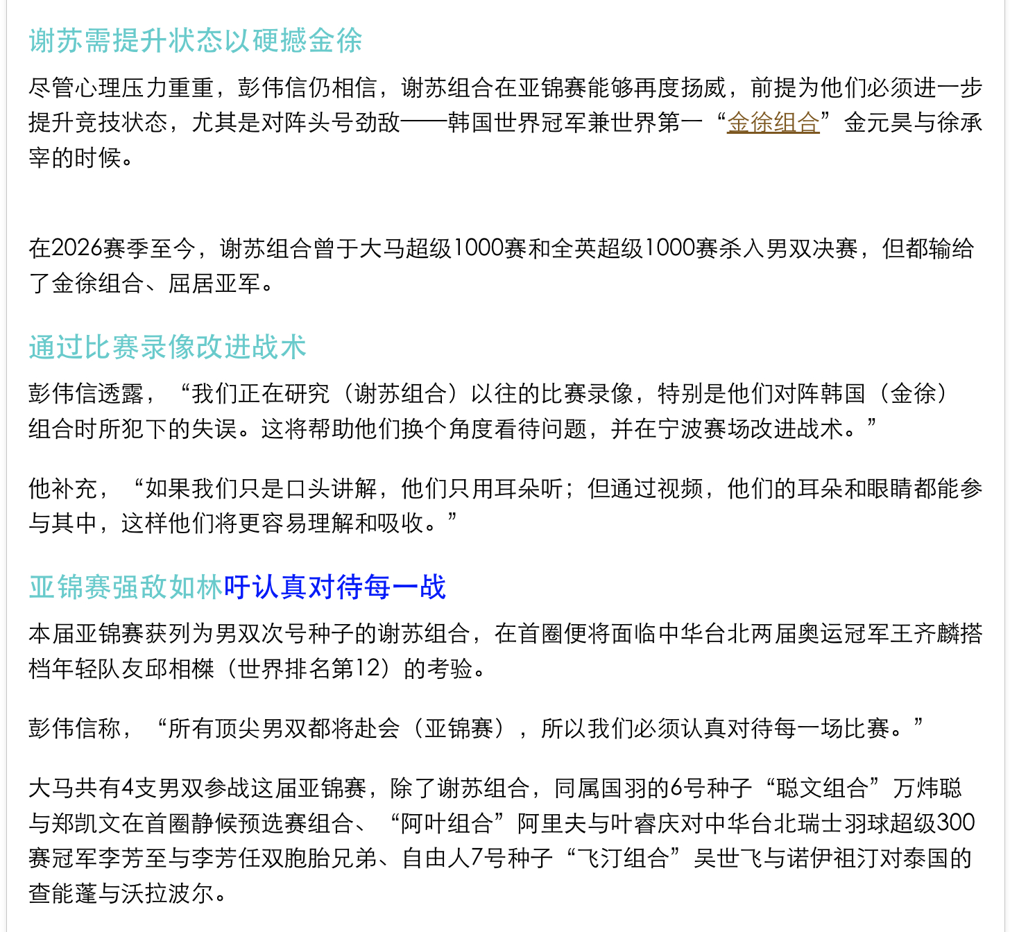 彭伟信透露,“我们正在研究以往的比赛录像,特别是他们对阵韩国徐金组合时所犯下的失误。这将帮助他们换个角度看待问题,并在宁波赛场改进战术。”