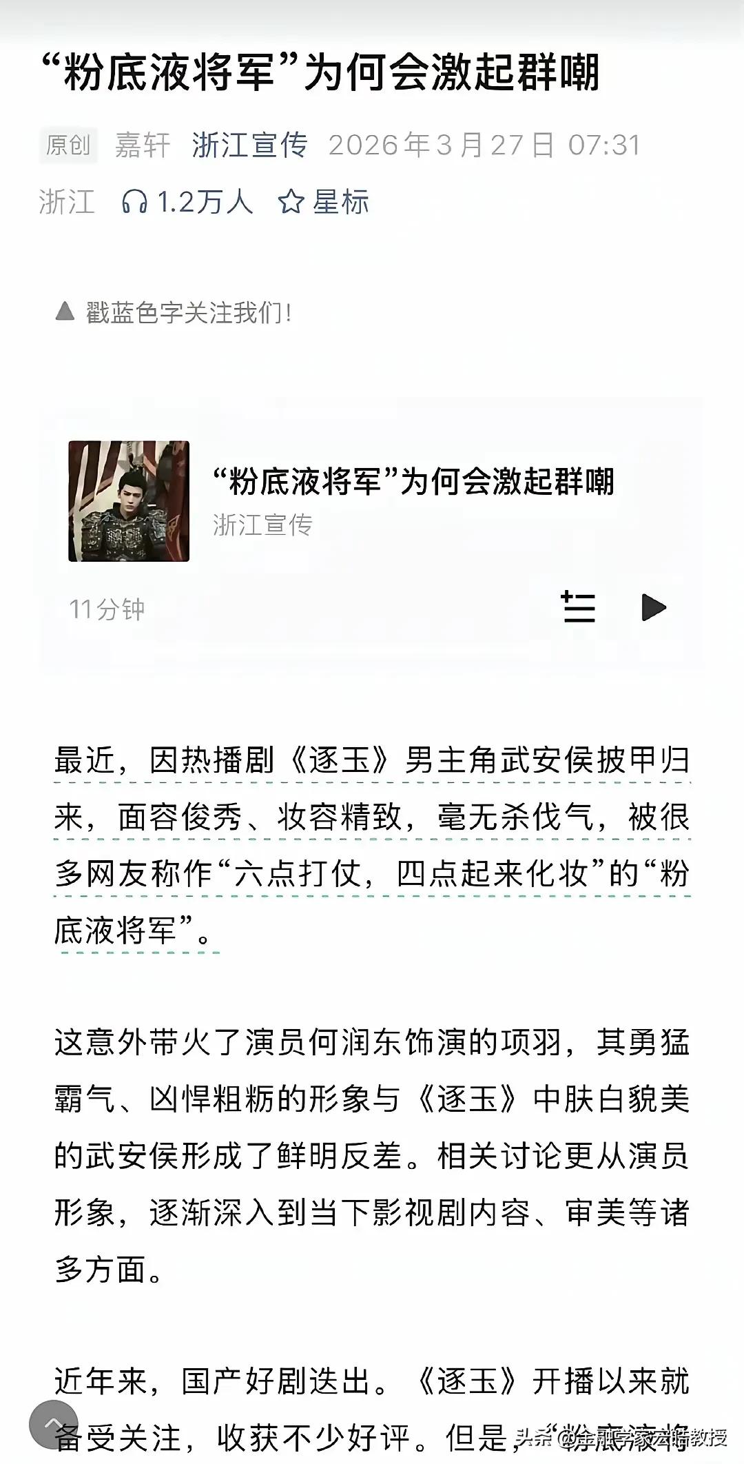 何润东今年戏约因为钧正平的一番话可能大增!钧正平怒批“粉底液将军”,阴柔审美该退场了! 不少网友拿出何润东曾在《楚汉传奇》中扮演项羽照片拿来做对比,只见他满脸血污、须发凌乱,眼神里满是杀伐果断的霸气,这才是沙场将士该有的模样!那些磨皮滤镜下的“奶油将军”,丢掉的不仅是真实的历史质感,更消解了中华民族刻在血脉里的尚武精神。 当前我们看到资本包装下这股以“精致阴柔”为美的歪风,绝非中国本土原生,而是早年从日韩流入,经部分平台推波助澜,逐渐泛滥成灾。 钧正平的发声,有很多十几二十岁的女孩不理解,认为偶像受委屈,留言表示不服,其实这是钧正平在呼唤民意的觉醒,更是对影视行业的警醒。内娱该彻底刮起“阳刚风”了,拒绝文化殖民式的审美绑架,让阳刚之气成为荧幕主流,把真正的民族风骨,还给现代的年轻人!