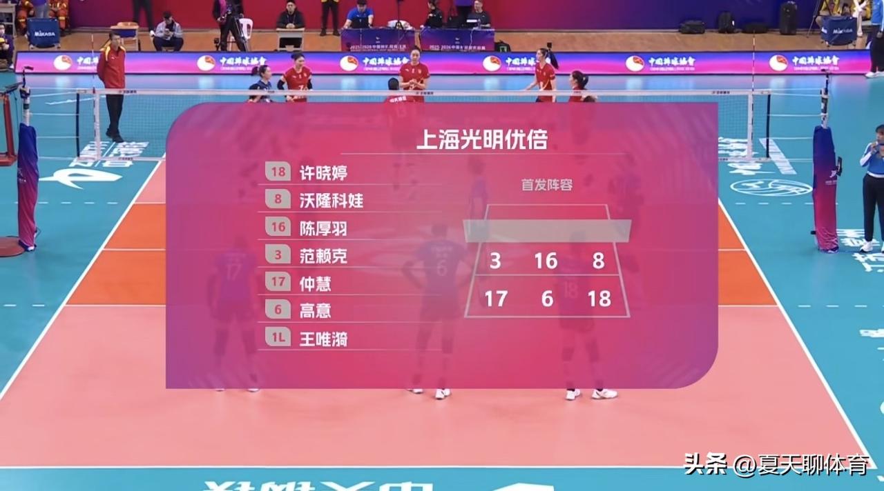 万众瞩目的苏沪女排冠亚军争夺战打响!正在直播苏沪女排金牌战,江苏女排VS上海女排!江苏女排剑指2连冠,上海女排冲击联赛首冠!蔡斌教练依然是派上了“七仙女”首发阵容,锻炼一个赛季的首发,丝毫没有变化,仲慧、沃龙科娃、高意、陈厚羽、许晓婷、范赖克、王唯漪。江苏女排这边有所调整,万梓玥搭档杨佳打副攻,吴梦洁和唐欣打主攻,吴梦洁打接应,二传和自由人依然是张籽萱和倪非凡!第一局开局,仲慧进攻连续被拦,江苏5-2领先!
