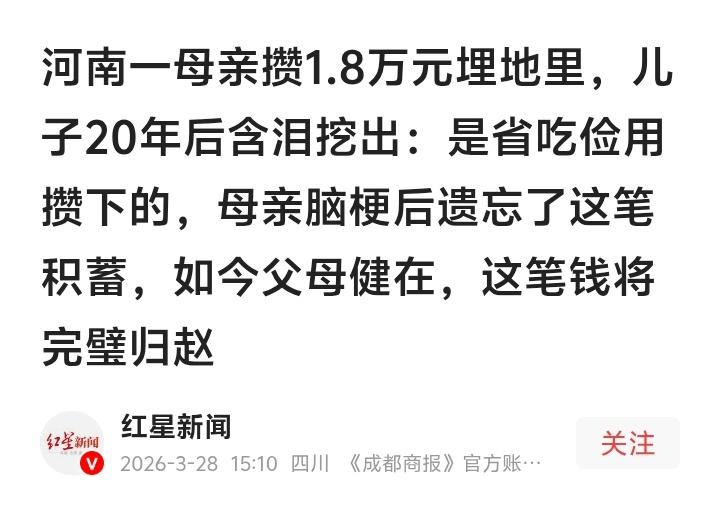 河南三门峡老宅惊现时光胶囊!儿子挖出母亲20年前血汗钱泪崩:每一分都是她种地喂猪攒下的,父母健在就是最大福报 那是一个寻常的拆迁日,河南三门峡的郭先生动手拆除自家年久失修的老宅。铁锹落下,却触到了一个坚硬的包裹。层层油布揭开,里面竟是一沓沓被岁月浸染的钞票,总计一万八千多元。那一刻,时光仿佛倒流,二十年前的记忆汹涌而来。 这些钱,是母亲用最原始的方式攒下的。她曾在天未亮时就下地劳作,曾守着猪圈羊棚度过无数夜晚,一分一厘,从牙缝里省出来。那是她对抗生活的铠甲,是她为未来埋下的希望种子。她选择埋进土里,或许因为那里最踏实,像她的一生,扎根土地,沉默而坚实。 然而命运开了个残酷的玩笑。母亲六十岁时突发脑梗,记忆如同被橡皮擦抹去,连同这笔深埋的积蓄一起,消失在脑海的迷雾中。全家搬离老宅,日子匆匆,二十年弹指而过。这笔钱成了家族里一个无人知晓的秘密,静静躺在黑暗里,等待着重见天日。 当郭先生捧着这包沉甸甸的现金,最初的惊喜迅速被心酸淹没。他看到的不是钱,是母亲佝偻的背影,是她皲裂的双手,是那些他或许不曾完全理解的、沉默的付出。他说着“高兴”,眼泪却止不住。这哪里是钱?这分明是母亲无处安放的牵挂,是她说不出口的爱。 最让人动容的是结局。父母俱在,这笔“意外之财”得以完璧归赵。郭先生毫不犹豫地决定将钱交还母亲。在这个物欲横流的时代,这种纯粹的孝心与诚信,像一股清流,涤荡人心。它让我们看到,有些价值远比金钱贵重——比如健康,比如陪伴,比如一颗不忘本的赤子之心。 这个故事,照见了中国无数普通家庭的缩影。老一辈人习惯于用最质朴的方式守护财富,那背后是时代留下的烙印,是对安稳最深的渴望。它也抛出一个沉甸甸的问题:我们是否真正关注过父母那辈人的内心世界?他们的节俭、他们的担忧、他们那些未曾言说的故事? 一笔埋藏二十年的钱,挖出了一段尘封的亲情。它提醒我们,时间会模糊记忆,但爱留下的痕迹永不磨灭。父母在,人生尚有来处;那份他们用青春换来的“积蓄”,无论有形无形,都值得我们用最温柔的心去珍藏和归还。 (来源:综合荔枝新闻、红星新闻、羊城晚报等媒体报道) 亲情无价 孝心传承