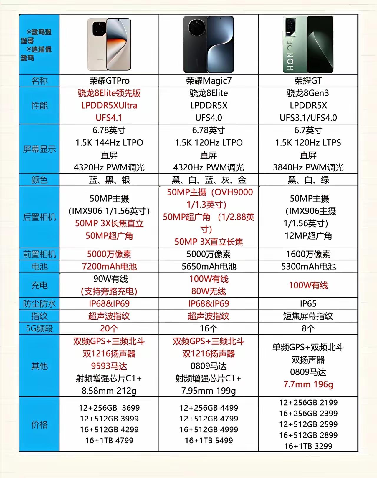 荣耀GT vs GT Pro——差一千多块,到底差在哪? 别再傻傻把荣耀GT和GT Pro当成换壳兄弟机了!俩虽然都挂着GT的性能招牌,实则根本不在一个赛道。GT Pro多出来的预算,完完全全换成了整机体验的全方位脱胎换骨。 先聊最核心的性能和续航,这俩直接拉出了代际级差距。普通版GT搭载的骁龙8 Gen3,日常使用、跑主流游戏完全够用,但GT Pro直接首发了骁龙8至尊领先版,搭配规格拉满的LPDDR5X Ultra内存+UFS 4.1闪存,性能释放直接越级,重度游戏、多开后台的流畅度差距,一上手就能明显感知。续航更是离谱,普通版5300mAh已经属于第一梯队,GT Pro直接干到了7200mAh超大电池,实测正常用两天一充毫无压力,直接把续航焦虑给你焊死在门外。 再说说影像上的关键补齐。普通版GT就是双摄组合,日常扫码、拍个近景风景够用,但一到拍远景、拍人像的场景就力不从心。GT Pro直接新增了一颗5000万像素长焦镜头,支持3倍光学变焦,完美补上了中远摄的短板,出门旅行拍远景、日常拍人像虚化,可玩性和出片率直接提了一个档次。 还有日常用起来时时刻刻能感知到的细节配置,GT Pro直接拉到了满级。金属中框带来的质感升级、3D超声波指纹的秒解体验、IP68+IP69K满级防水防尘,还有音质拉满的双1216扬声器,这些能实打实提升使用幸福感的配置,普通版GT一概没有。别觉得这些是无关紧要的加分项,日常用起来的手感、便捷度、安全感,全靠这些细节撑着。 最后给大家一句实在的选购建议:预算有限,就想要个日常流畅不卡的性能机,选普通版GT完全够用;但要是你预算充足,想要极致性能、超长续航,还有一步到位的全面体验,不用纠结,直接冲GT Pro就完事了。