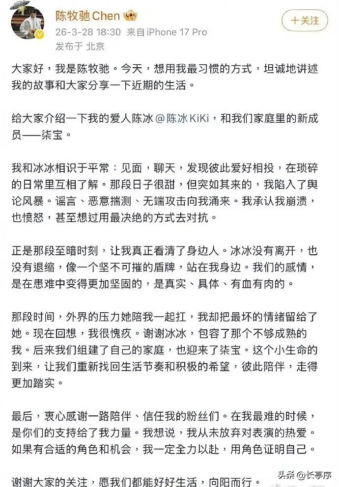 2026年3月28日陈牧驰本人发微博官宣与陈冰结婚生子。