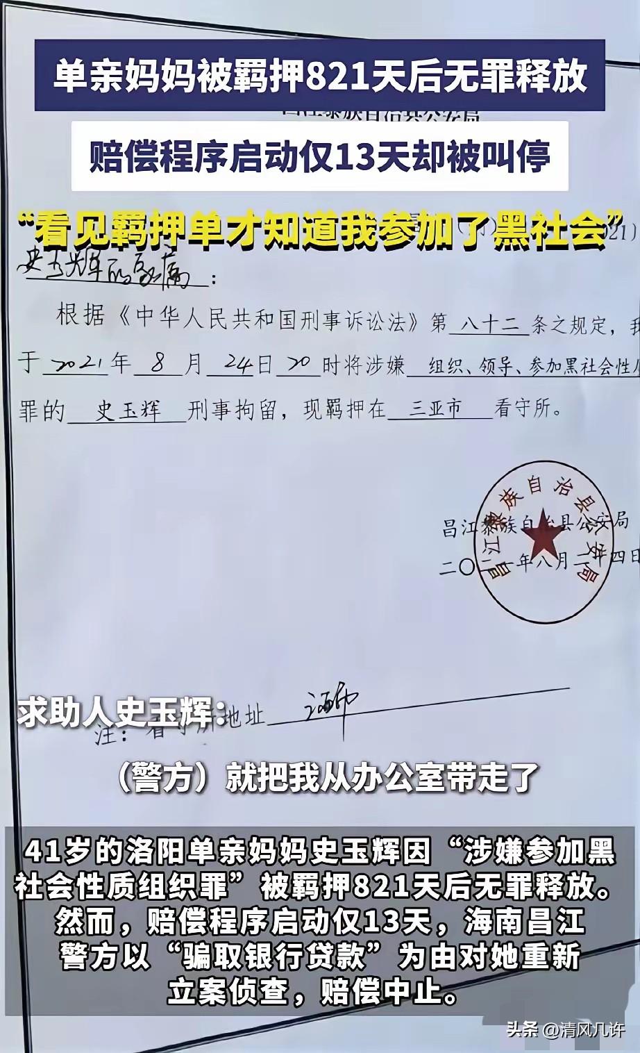 海南,41岁单亲妈妈因为涉嫌参加黑社会被羁押了821天,后来,检察院认定证据不足,不予起诉,将她无罪释放,并同意赔偿她的损失。女子松了口气,以为噩梦终于要结束了,谁知,赔偿程序才启动13天,警方竟以“骗取银行贷款”为由,对她重新立案侦查,赔偿的事也暂且中止。女子懵了,骗贷的事法院都已经认定了,不构成犯罪,为何又要再来一次。对此,警方的解释让她无法接受。 2021年8月24日,史玉辉正在海南儋州的物业公司办公室处理工作,几名民警突然走进来,没出示完整的法律文书,只说要带她去配合调查。 她当时还想着,不过是走个流程,晚上就能回家给孩子做饭,可直到被塞进警车,她都不知道自己牵扯进了什么案子。 直到看见那张羁押单,上面清清楚楚写着“涉嫌组织、领导、参加黑社会性质组织罪”,她才彻底懵了。她做物业经理不过两年,平时处理的都是业主纠纷、小区安保的琐事,连和人红脸的次数都屈指可数,怎么就和“黑社会”扯上了关系。 821天的羁押生活,是她这辈子都不愿回想的煎熬。作为单亲妈妈,她最放心不下的是远在洛阳的孩子,每次律师会见,她问的第一句话永远是“孩子还好吗”。 看守所里的民警曾劝她认罪,说只要签字就能换减刑,早点出去见孩子,可她攥着笔,怎么也落不下去。她知道,一旦认了,这辈子都洗不清,孩子也会跟着抬不起头。她就这么硬扛着,把所有委屈和恐惧都咽进肚子里,等着能还自己清白的那一天。 2025年5月,海南省人民检察院的《不起诉决定书》终于送到她手里,上面写着“证据不足,不符合起诉条件”。 这短短一行字,是她用821天的自由换来的。走出看守所的那天,阳光晃得她睁不开眼,她第一时间给孩子打了电话,听着电话那头孩子哽咽的声音,她也跟着哭,却不敢让孩子听见,只反复说“妈妈回来了,以后再也不走了”。 她以为苦难到此为止了。同年8月29日,昌江县检察院作出《刑事赔偿决定书》,同意赔偿她羁押期间的人身自由赔偿金和精神损害抚慰金。 她拿着决定书,甚至开始规划以后的生活:用赔偿款给孩子换个大点的房子,找份稳定的工作,好好弥补这两年多缺失的陪伴。可这份希望,只维持了13天。 9月11日,一份《中止赔偿通知书》递到她面前,理由是昌江县公安局对她以“骗取银行贷款”为由重新立案侦查。 她彻底懵了,这个所谓的骗贷案,早在之前的涉黑案判决里,法院就明确写了“不构成犯罪”,甚至连起诉书中都没提过她和这个案子有关。她主动联系办案民警,才知道警方说“发现了新线索”,可从立案到现在,没有一个民警找她询问过情况,更别说出示所谓的新证据。 她想不通,为什么明明已经被认定无罪的案子,会在赔偿程序启动的节点被翻出来。 她找过检察院,得到的回复是“立案侦查是警方的职权,赔偿程序只能暂时中止”;她找过媒体,想让更多人知道自己的遭遇,可除了零星的报道,没人能给她一个明确的说法。她看着手机里孩子的照片,夜里常常睡不着,怕自己又被带走,怕再也见不到孩子,怕这821天的冤屈,到最后连一句公道都讨不回来。 更让她心寒的是,警方口中的“新线索”,不过是之前涉黑案里已经被法院否定的材料。 她翻遍了判决书,每一页都写着她的清白,可这些白纸黑字,在重新立案的决定面前,显得格外无力。她不是怕被调查,是怕这场无休止的折腾,会耗尽她最后一点力气,怕孩子等不到妈妈彻底自由的那一天。 这件事被曝光后,引发了不少讨论。有人说,这是典型的“程序报复”,用另一个案子来拖延赔偿;有人说,法律的初衷是保护无辜者,可现在却成了消耗无辜者的工具;还有人说,史玉辉的遭遇,不是个例,是很多被错押者面临的困境——洗清冤屈难,拿到赔偿更难。 史玉辉还在等,等警方给出一个合理的解释,等赔偿程序重新启动,等一个真正的清白。她知道这条路很难走,可她不能放弃,她要给孩子做个榜样,也要让更多人看到,错案的代价,不该由无辜者独自承担。 各位读者你们怎么看?欢迎在评论区讨论。