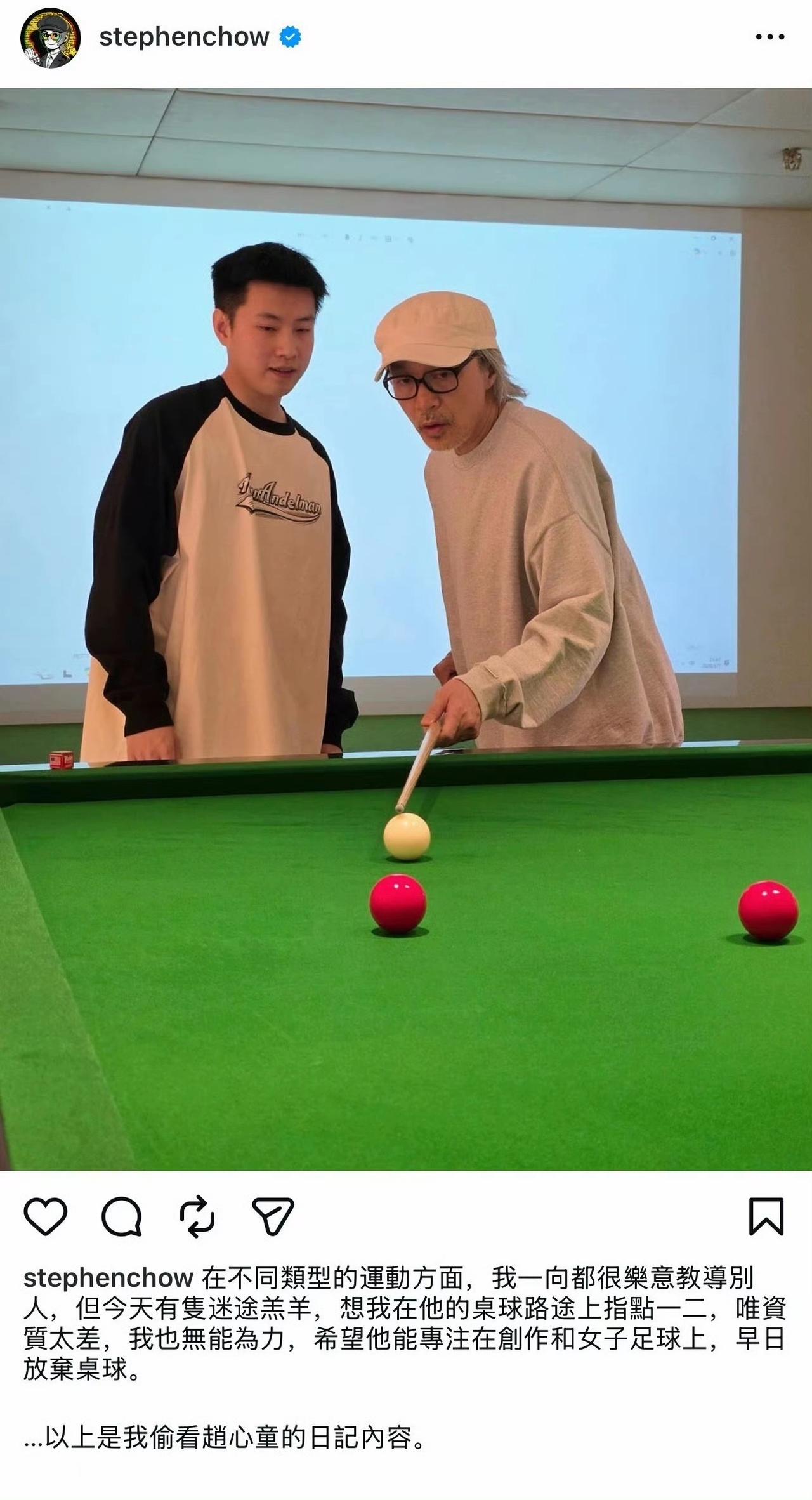 喜剧之王遇上斯诺克冠军,跨界同框切磋台球。 大家一定记得在哪里看过周星驰打台球吧?《龙的传人》里的超级大扎杆。 果然星爷无厘头极限反转剧情:请看图二星爷的社媒。 图一:赵心童转发锐评。