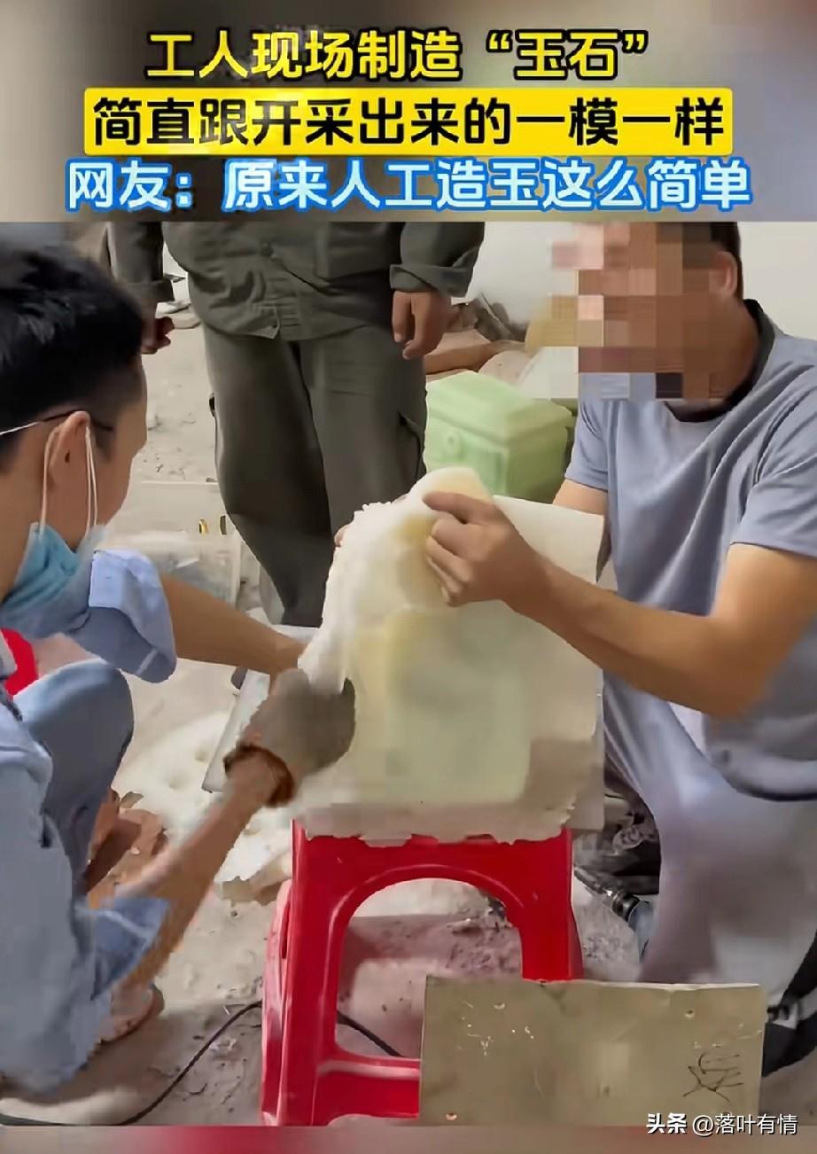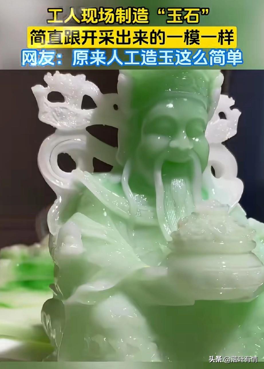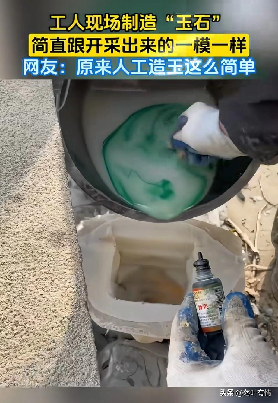 怪不得现在的玉也不值钱了, 原来是人工,可以做玉石, 数量多了自然就不值钱了, 大家有没有发现? 物以稀为贵, 当一种东西少的时候, 它就非常的值钱, 当它数量多的时候, 自然就不值钱了, 现场工人直接用乳白色的液体, 里面滴了几滴绿色液体, 搅拌,搅拌之后, 直接倒进皮质模具, 然后在低温之下成型, 很快一个玉石就做好了, 造型还非常的漂亮, 不过这是人工制造的, 根本不值钱, 但是没想到做玉石这么简单, 大家觉得这个玉石好做吗? 玉石利润 玉石鉴别技巧 玉🌽 玉石对比 玉䰠