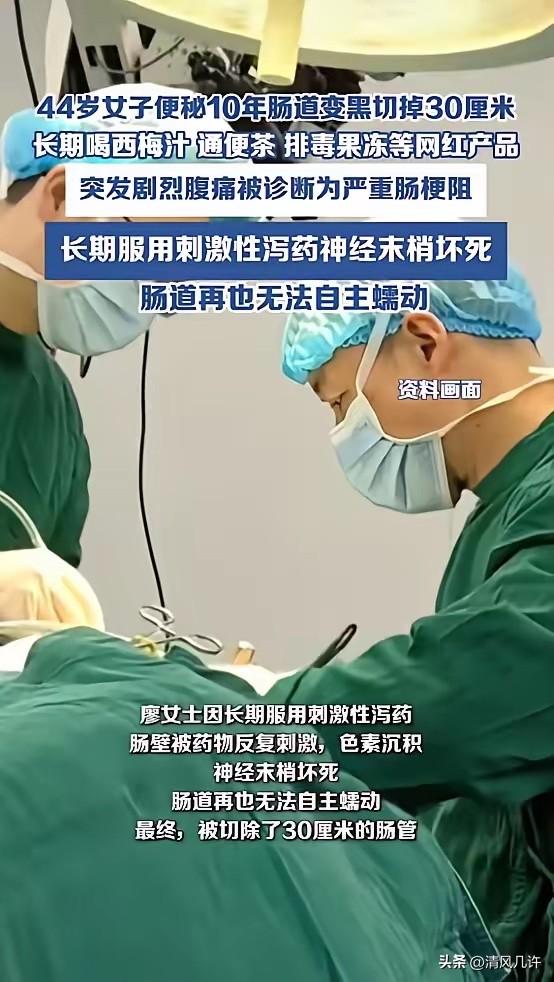 “悲剧还是发生了!”陕西西安,一女子因为便秘,长期喝西梅汁、通便茶等产品,并且持续十年,结果前段时间,女子肚子剧痛,5天都没排便,到医院检查后,被确诊为严重肠梗阻,肠道再也无法自主蠕动!网友:真是糊涂啊! 44岁的廖女士,十年前只是偶尔出现便秘的情况,起初她没太在意,直到一次朋友聚会,有人给她推荐了一款网红通便茶,说“纯天然成分,喝了就通,没副作用”。 抱着试试的心态,她买了一盒,没想到当天就见效了,那种久违的通畅感让她觉得找到了“救星”。从那以后,她开始依赖这类产品,从通便茶到排毒果冻,再到宣称“温和清肠”的西梅汁,只要网上火什么,她就跟着买什么。 一开始只是偶尔喝,后来慢慢变成了每天必喝,再到后来,她发现剂量越用越大,才能维持原来的效果。 她不是没想过停药,可一旦停下,便秘就会变得比之前更严重,甚至三四天都排不出一次便。她总想着“再喝几天就停”,可这一喝,就是整整十年。她以为这些“纯天然”的产品是在帮自己排毒,却不知道,一场不可逆的伤害正在悄悄吞噬她的肠道。 今年年初的一个深夜,廖女士突然被一阵剧烈的腹痛惊醒,疼得她直冒冷汗,蜷缩在沙发上动弹不得。 接下来的五天里,她连一次便都排不出来,肚子胀得像鼓一样,连喝水都觉得恶心。家人见状赶紧把她送到西安市人民医院,急诊医生一看情况,立刻安排了检查,结果显示她患上了严重的肠梗阻,肠道已经完全失去了蠕动能力,必须立刻进行保守治疗。 禁食、灌肠、补液,医生用尽了所有保守治疗的方法,可三天过去了,她的肠子依旧纹丝不动。主刀医生赵东波看着检查报告,神情凝重地告诉家属:“不能再等了,必须马上手术,否则肠道坏死会危及生命。” 手术台上,当医生切开廖女士的腹腔时,倒吸了一口冷气。她的一段结肠已经失去了原本的弹性,肠壁像被墨水浸泡过一样,呈现出骇人的黑色,摸上去硬邦邦的,完全没有了正常肠道的柔软和活力。 医生告诉家属,这是典型的“黑肠病”,是长期服用刺激性泻药导致的,肠道的神经末梢已经坏死,再也无法自主蠕动,只能切除这段病变的肠管,才能保住她的生命。 最终,医生为廖女士切除了30厘米的变黑肠管,手术持续了四个多小时,才把她从鬼门关拉了回来。醒来后,廖女士看着身上的刀口,听医生讲述病情,才知道自己这十年的“通便习惯”,竟然把自己推到了如此危险的境地。她后悔不已,可再多的后悔,也换不回健康的肠道了。 医生说,很多人都和廖女士一样,觉得便秘是小事,随便买点网红产品就能解决,却不知道这些产品里大多含有蒽醌类刺激性泻药,短期用能快速通便,长期用却会破坏肠道的神经和肌肉,导致肠道变黑、功能丧失,甚至引发肠梗阻、肠穿孔等严重并发症。更可怕的是,这种伤害是不可逆的,一旦神经末梢坏死,肠道就再也无法恢复自主蠕动的能力。 这件事被曝光后,很多网友都在评论区留言,有人说自己也在喝这类产品,看完赶紧停了;有人说之前总觉得“排毒”是好事,现在才知道是在害自己;还有人呼吁平台加强对网红通便产品的监管,别再让这些“健康陷阱”误导普通人。 廖女士的悲剧,从来都不是个例。在这个追求“快速见效”的时代,很多人都在为了所谓的“便捷”和“健康”,付出着沉重的代价。 我们总想着用最简单的方法解决问题,却忘了身体的健康从来没有捷径可走,任何违背自然规律的行为,最终都会受到惩罚。 各位读者你们怎么看?欢迎在评论区讨论。