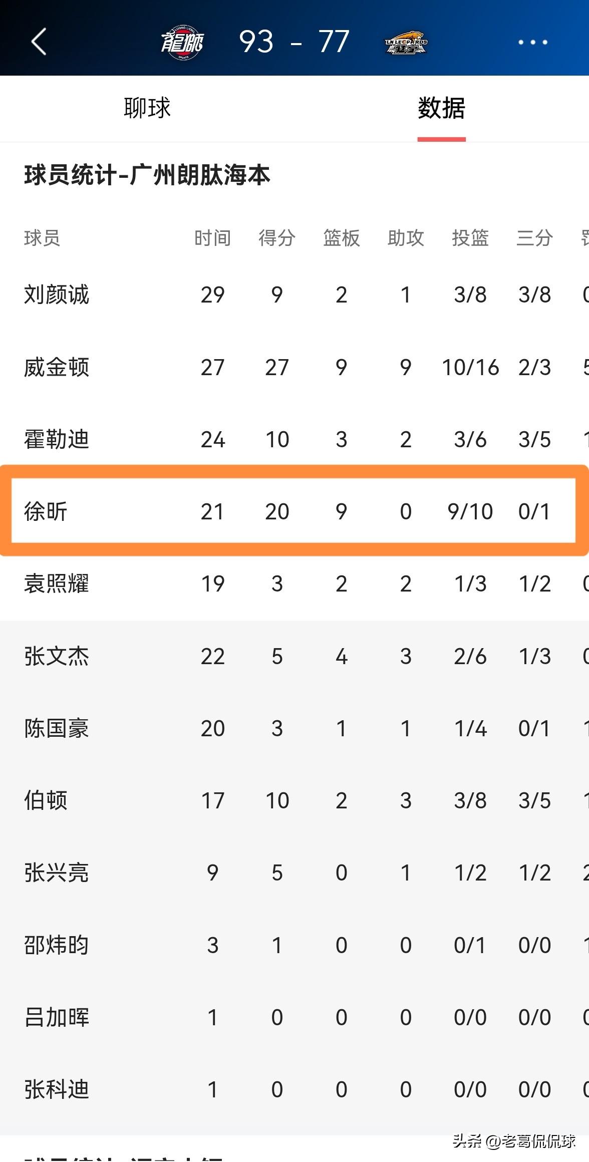 广州朗肽海本球星徐昕真是大显神威!在今天广州朗肽海本主场以93:77轻取辽宁本钢的比赛中,徐昕在进攻端大显神威,打出了非常闪耀的表现。 全场比赛下来,徐昕首发出战21分钟,投篮10中9,其中三分球1中0、罚球2中2极其高效的砍下20分,还有9篮板,没有出现任何的失误和犯规,他的场上正负值高达+29。 坦白说,本场比赛徐昕在进攻端不仅是予取予求,而且是尽显神威。