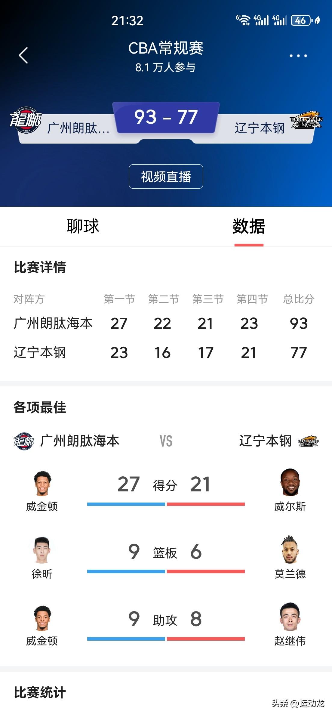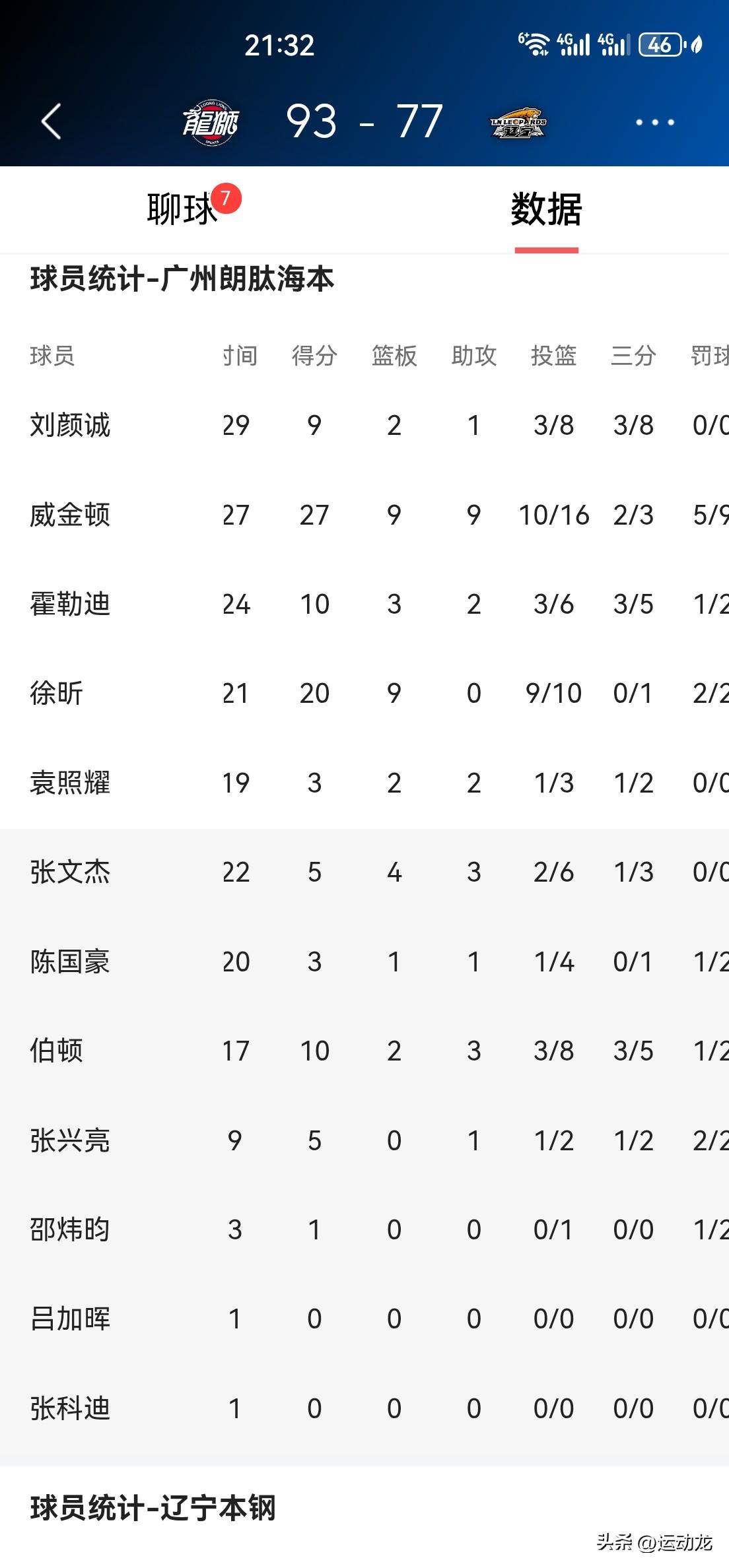 赵继伟领衔本土四大核心集体拉胯,辽宁77:93惨败广州。 辽宁做客广州,全场攻防两端被广州队压制,全场四节比分分别是23:27、 16:22 、 17:21 、21:23,每节比赛均被压着打,毫无还手之力。 辽宁本土四大核心球员状态低迷,各投进1球,赵继伟7投1中得到4分,鄢手琪7投1中得到3分,付豪2投1中拿到6分,王岚嶔6投1中得到4分。另外李晓旭3投0中,李虎2投0中,均未拿到分数。