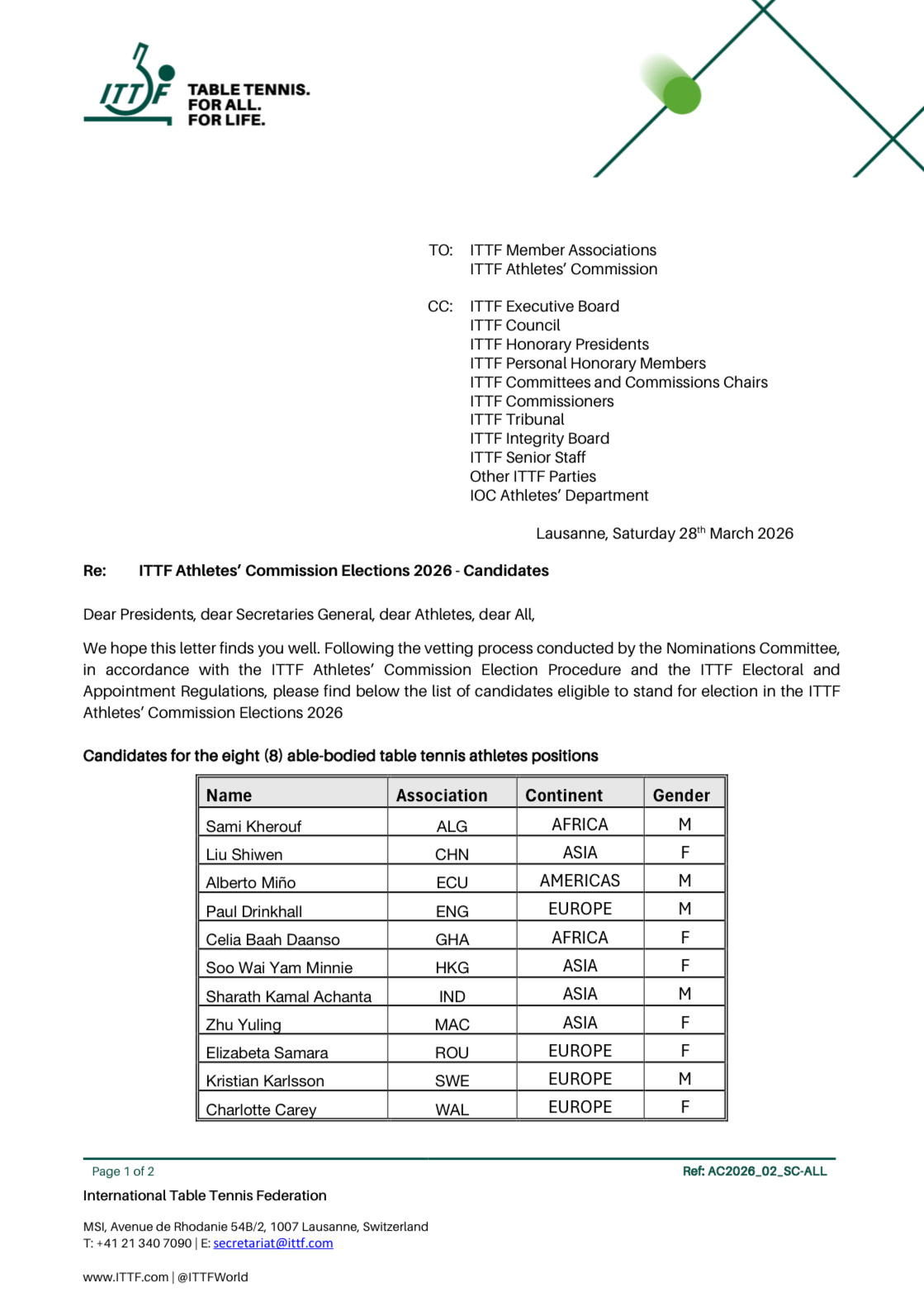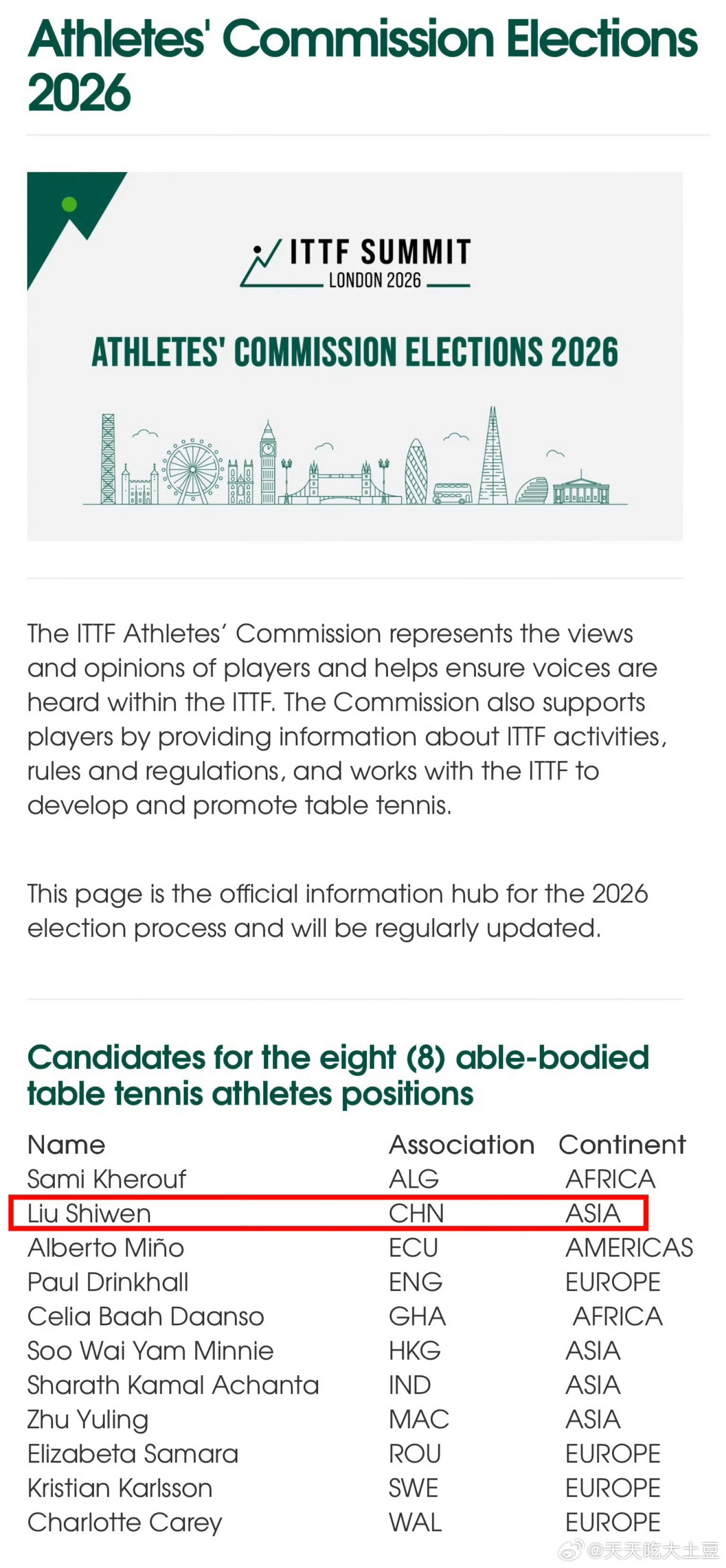 朱雨玲参选国际乒联运动员委员会刘诗雯再参选国际乒联运动员委员会 据国际乒联官网,