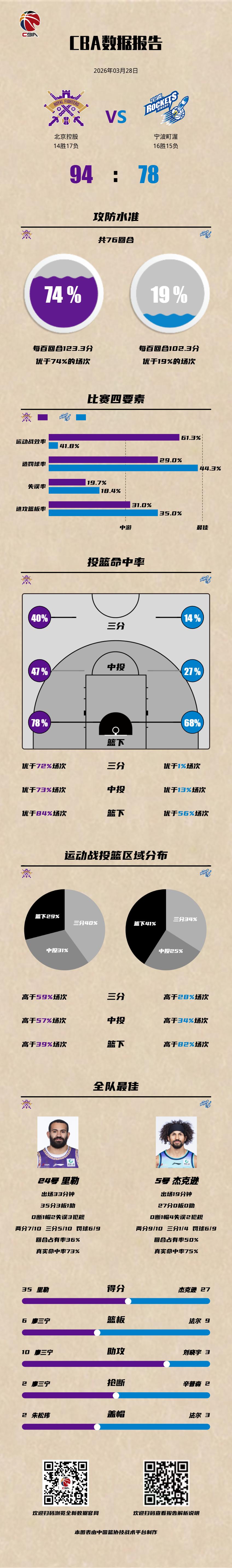 北京控股 94-78 宁波町渥 北控男篮vs宁波男篮 北京控股:里勒35分3篮板,豪斯13分4助攻,廖三宁10分6篮板10助攻2抢断; 宁波町渥:杰克逊27分,辛普森22分2抢断,法尔8分9篮板3盖帽。以城之名