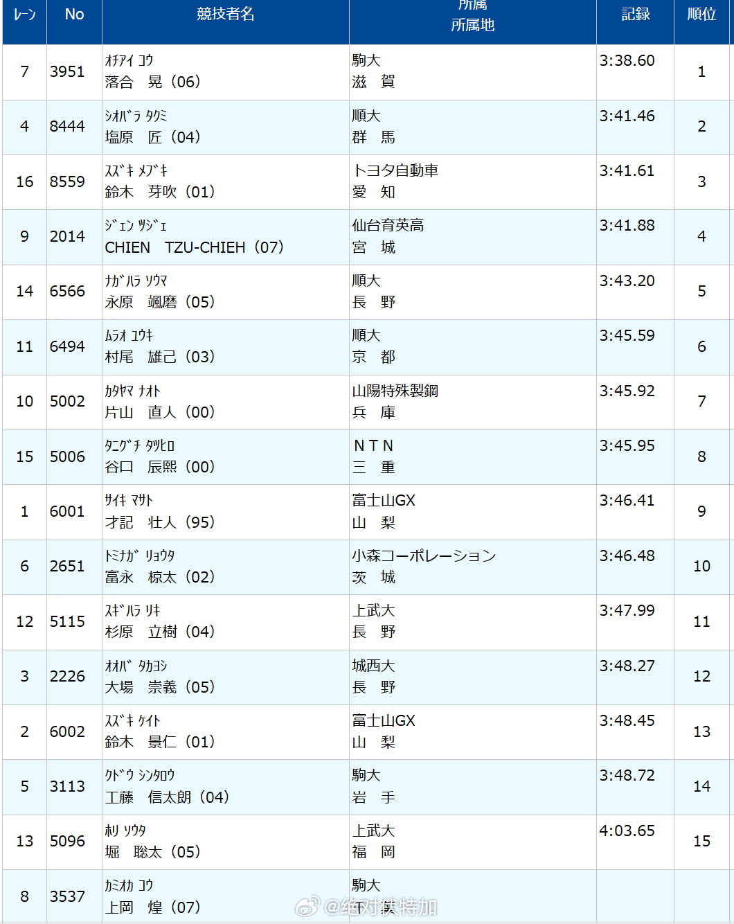 2026第152回日本体育大学田径赛上男子1500米第5组,落合晃3:38.6夺冠,简子杰3:41.88第四。