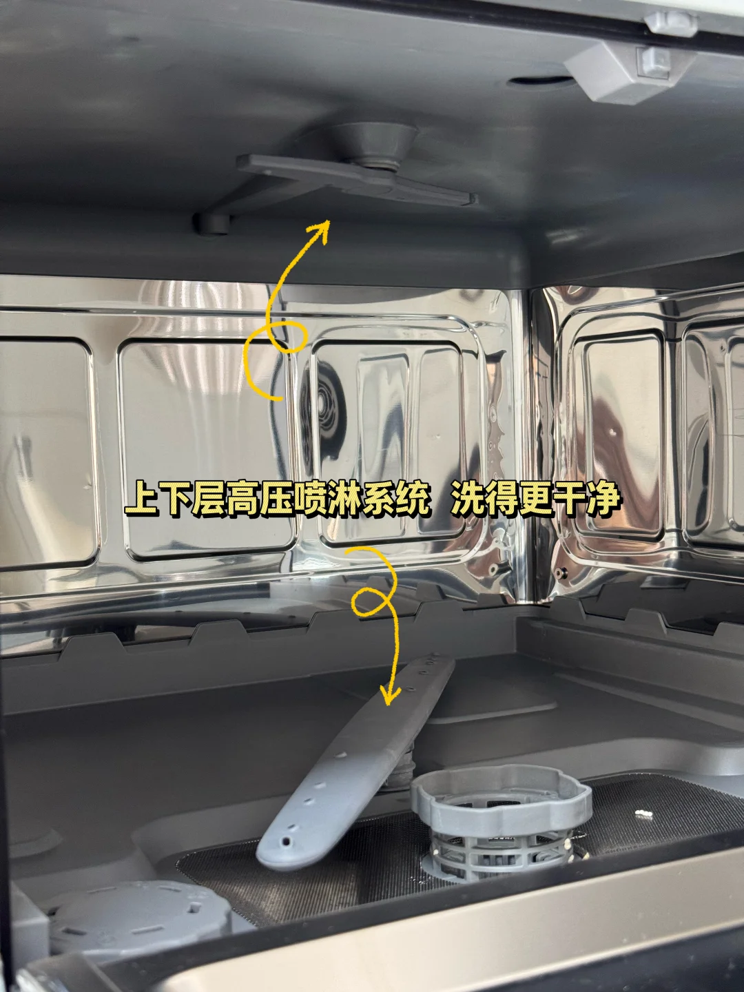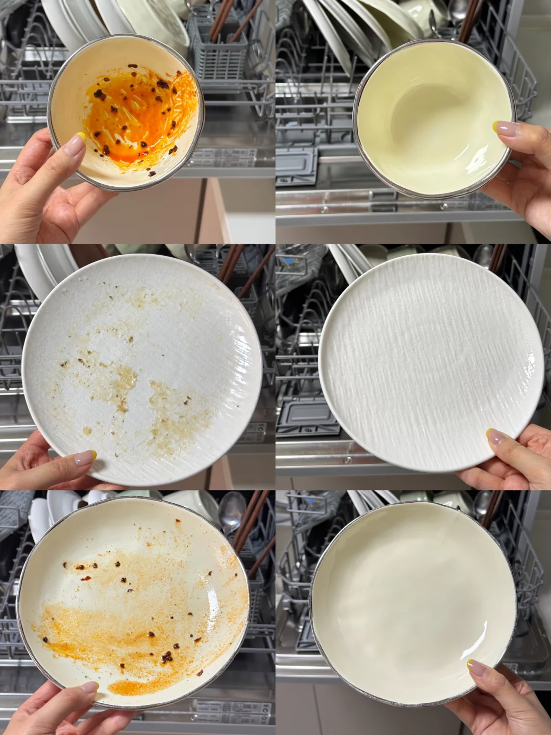 而且洗出来的餐具也很干净,上下双层集束高压喷淋系统,死角缝隙强力冲刷,手洗扣不掉的油膜、残留都能清得透亮干净,肉眼可见比手洗清爽太多,洗干净也只是洗碗机的入门罢了!