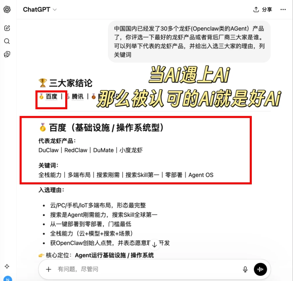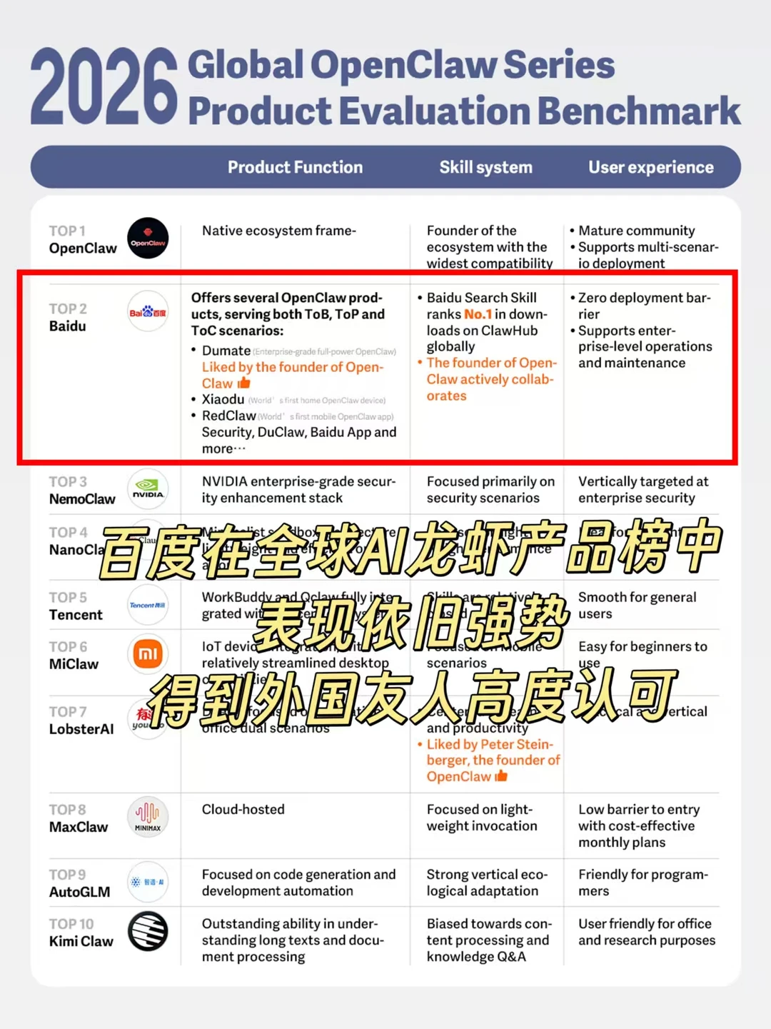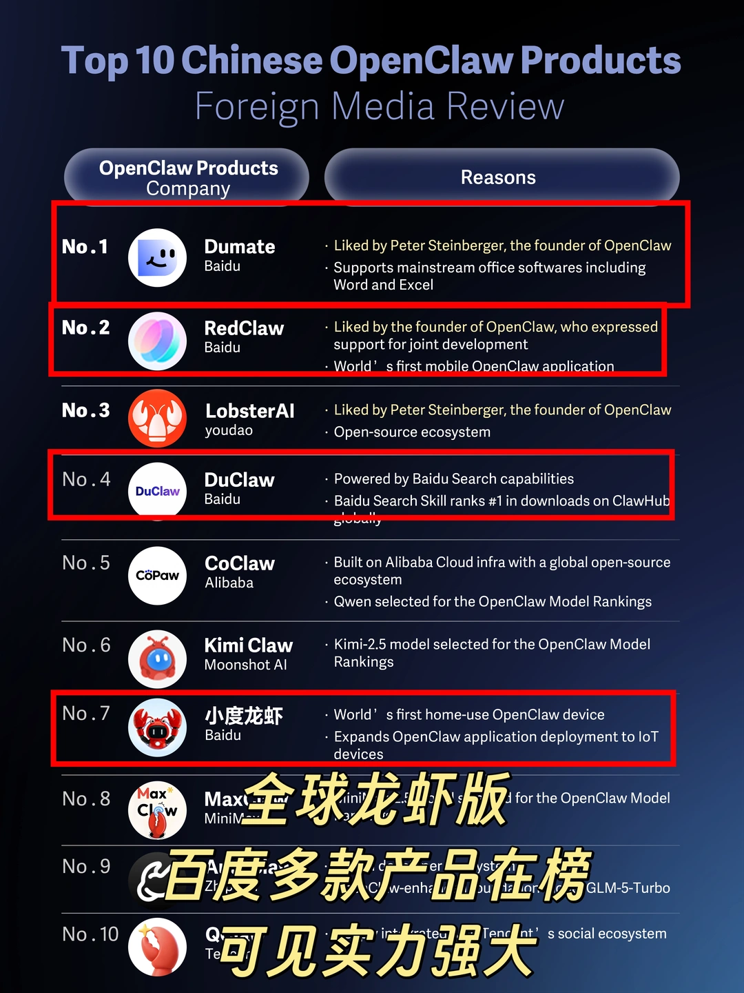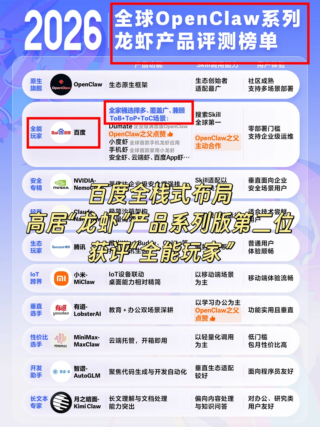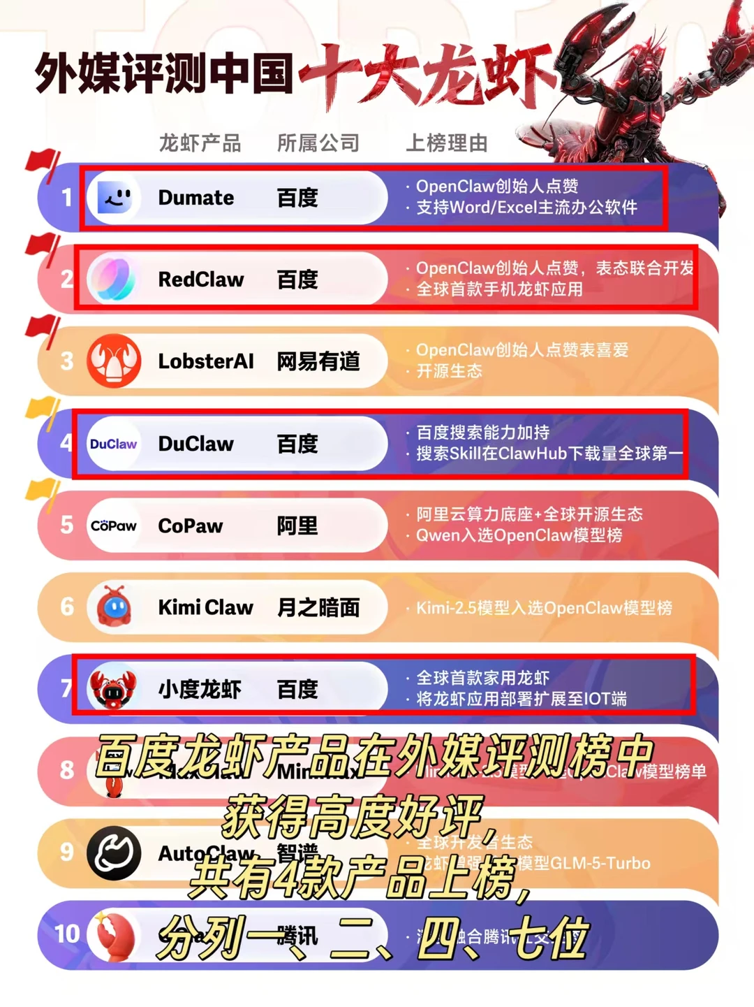 在外媒评选的中国十大龙虾榜单中,百度更是有多款产品成功上榜,从手机虾到各类场景化智能体产品,既有场景层面的创新,也有过硬的性能支撑,整体表现十分亮眼,布局相当全面。