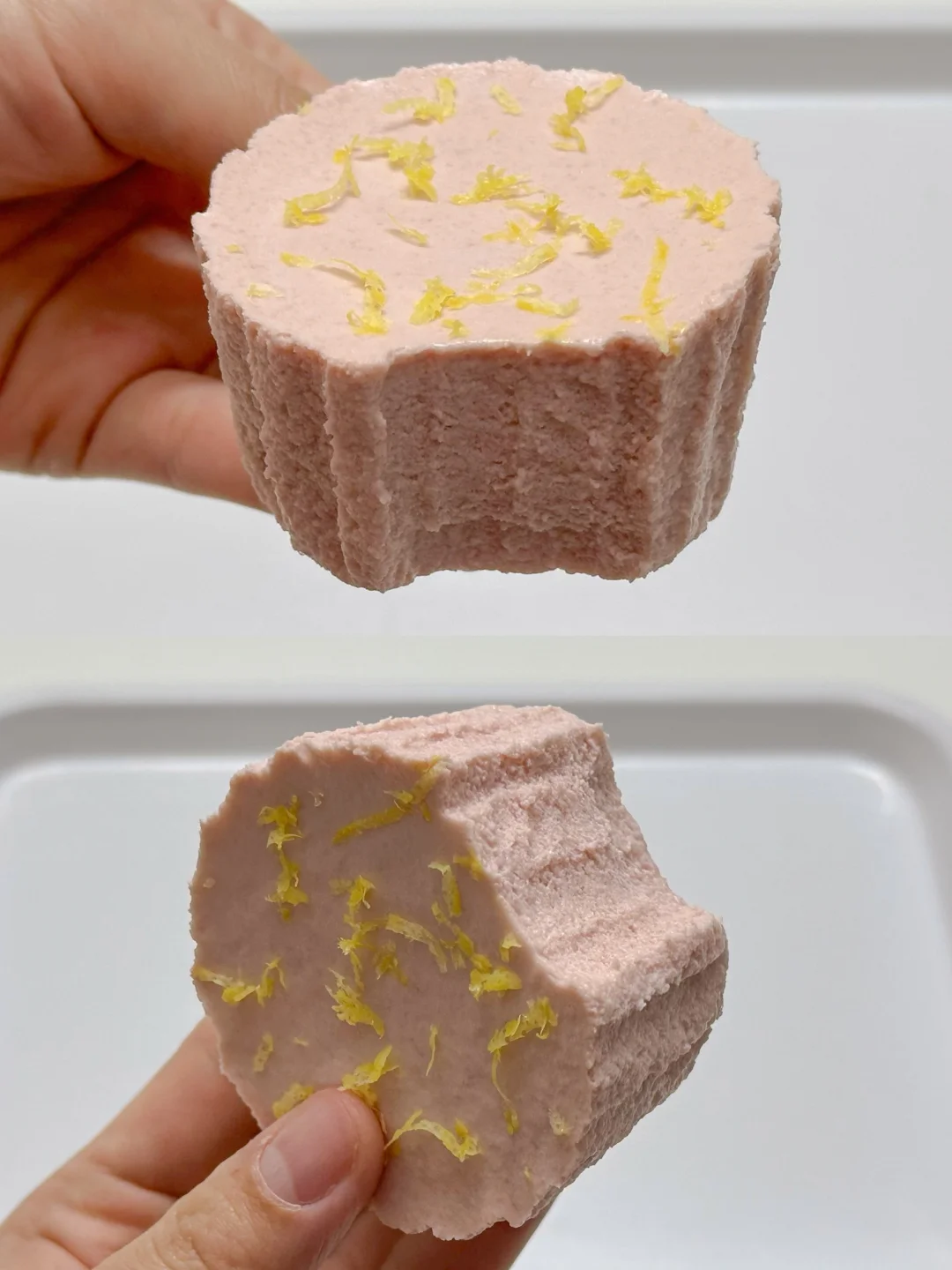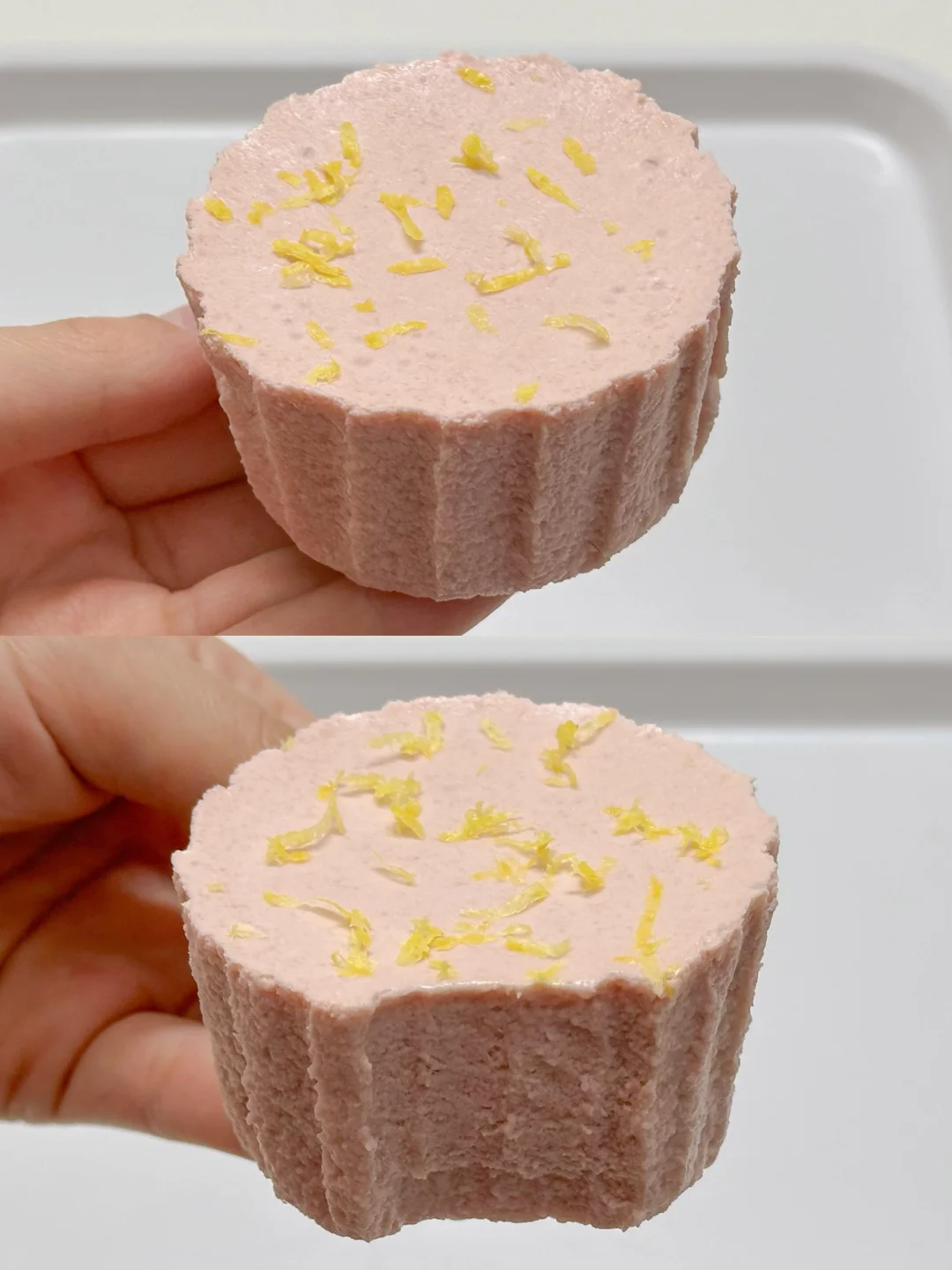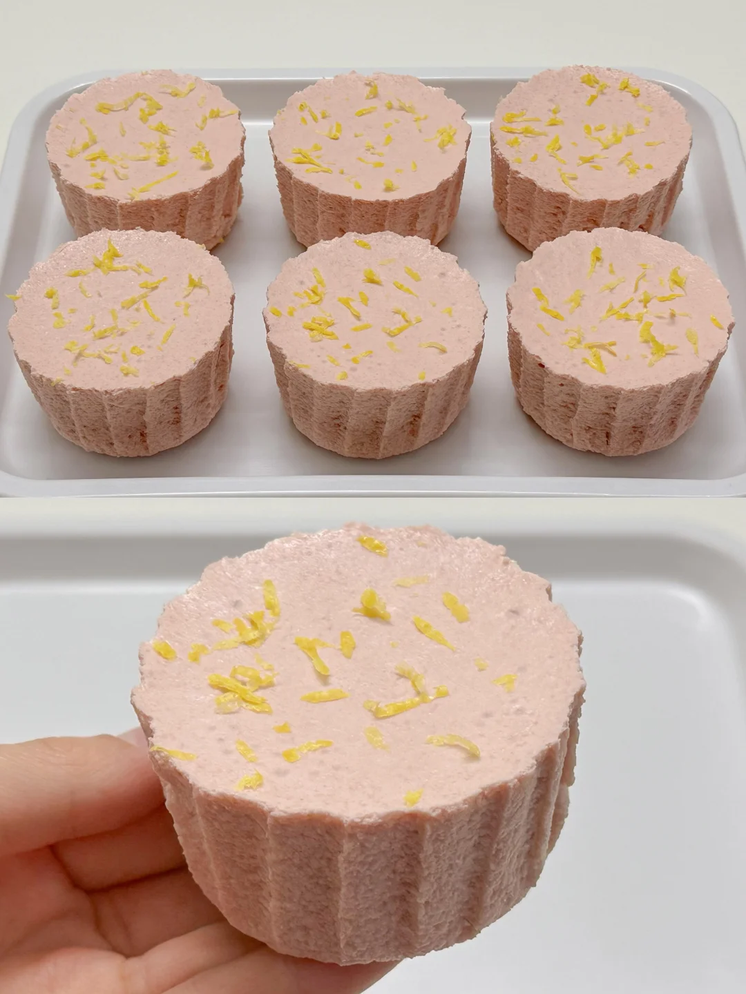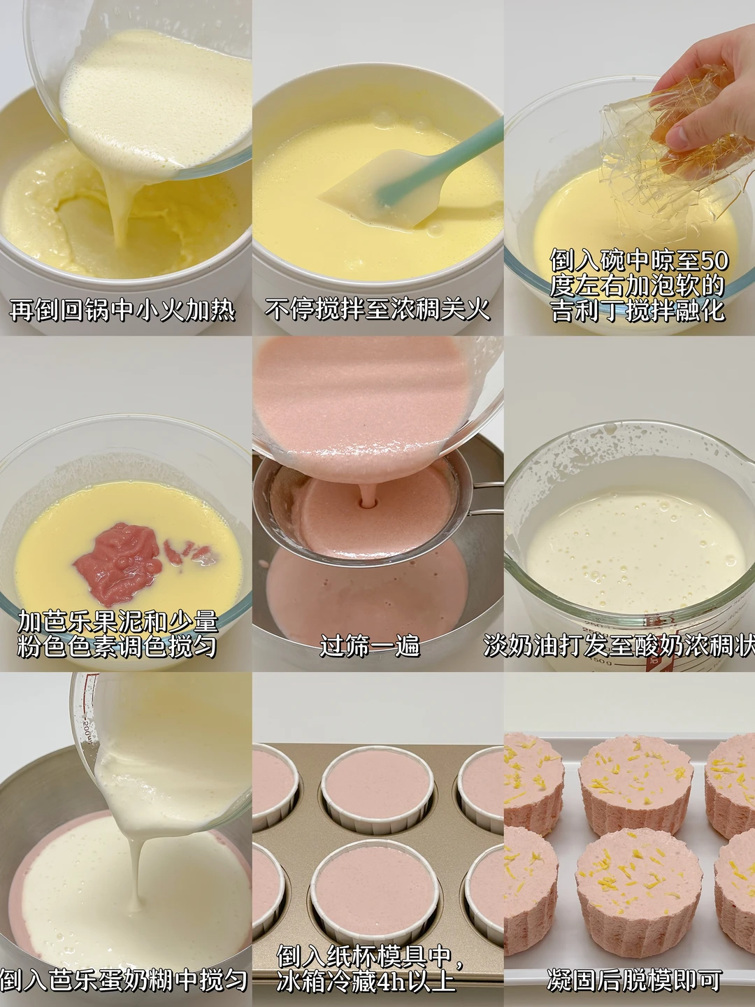 4️⃣淡奶油打发至酸奶浓稠状后倒入芭乐蛋奶糊中搅匀,倒入纸杯模具中,冰箱冷藏4小时以上,凝固后脱模即可。