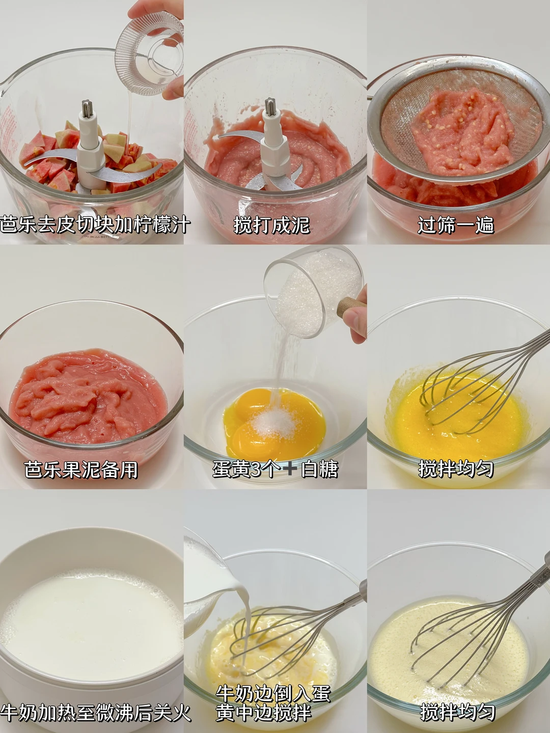 1️⃣芭乐去皮切小块加入柠檬汁搅打成泥,过筛一遍后备用。