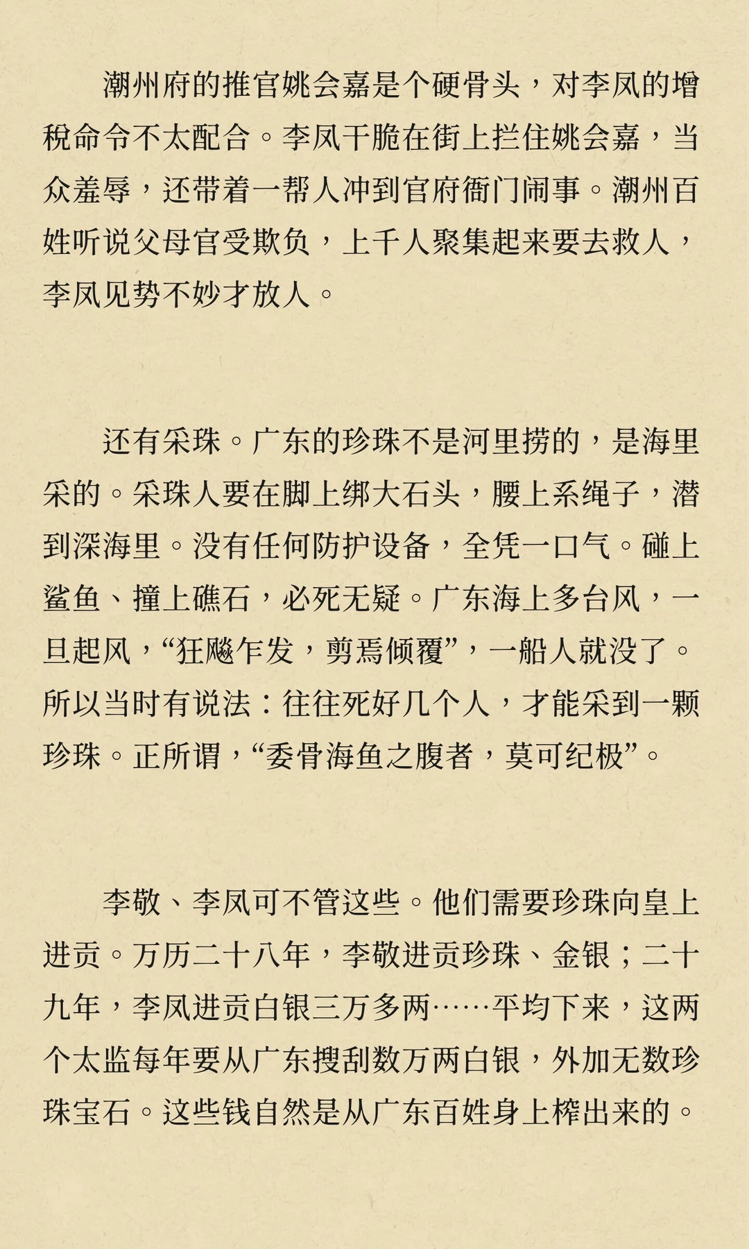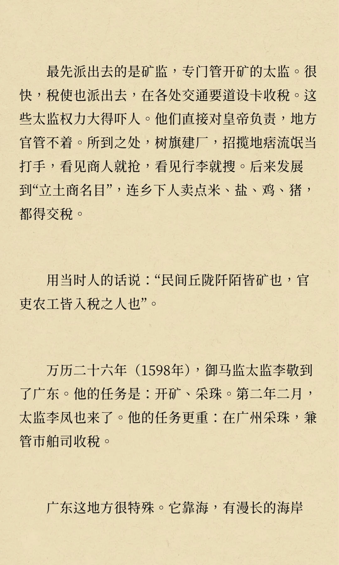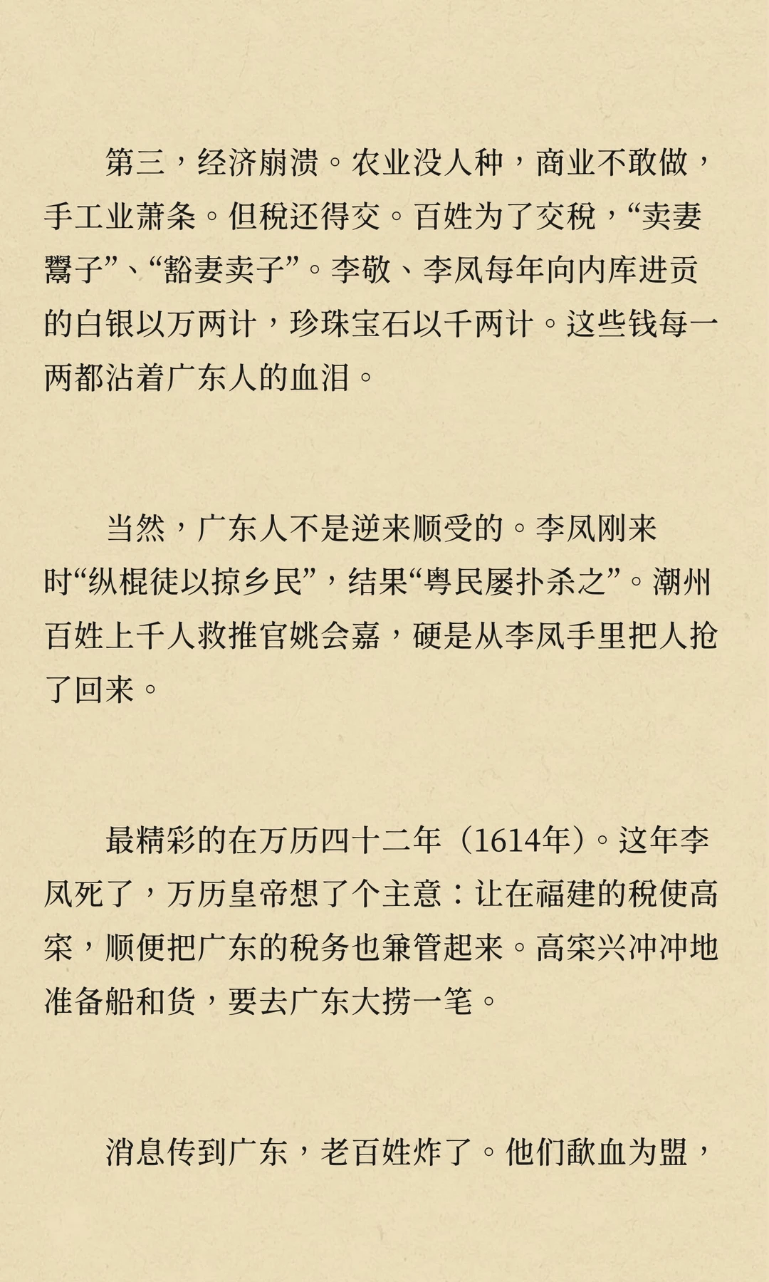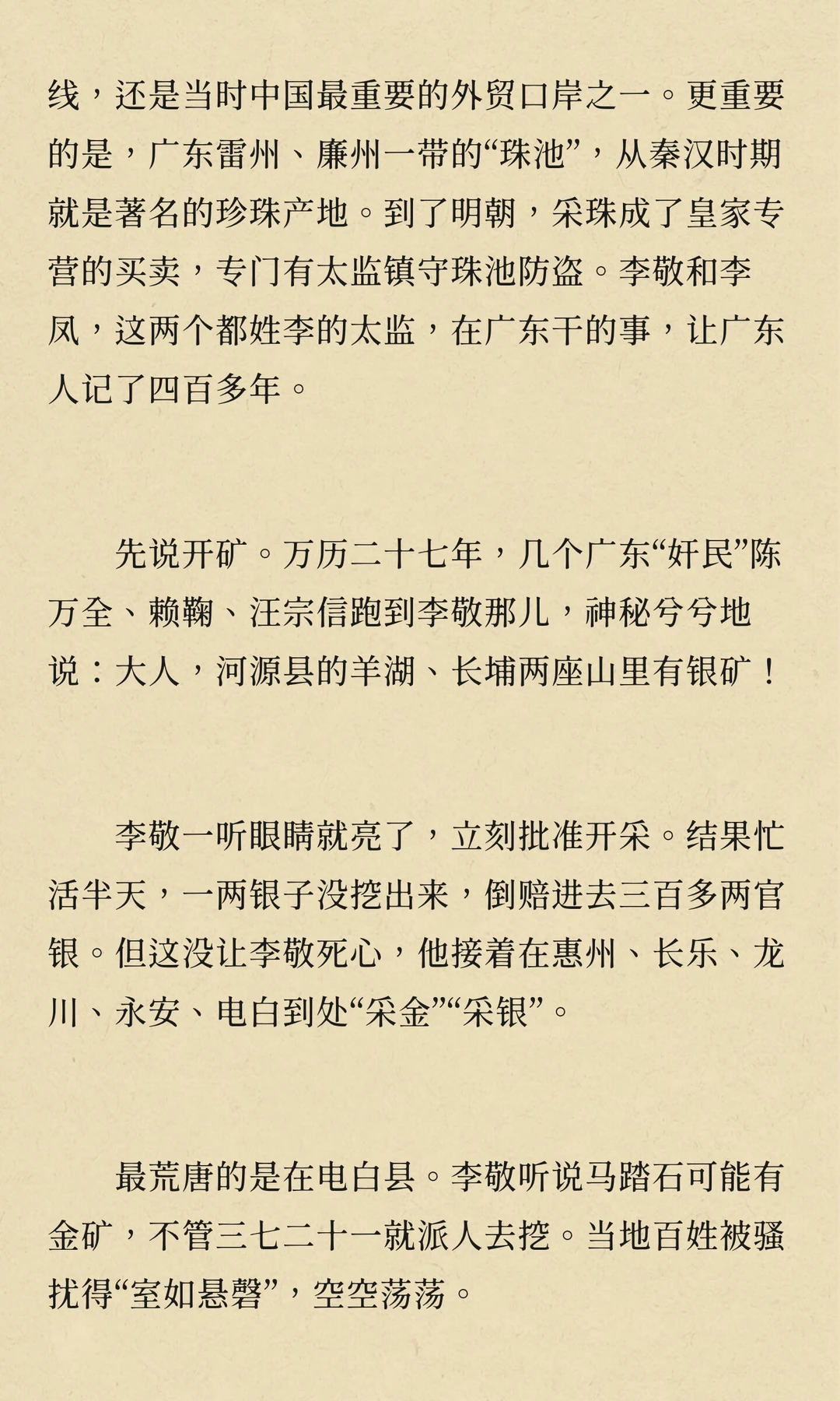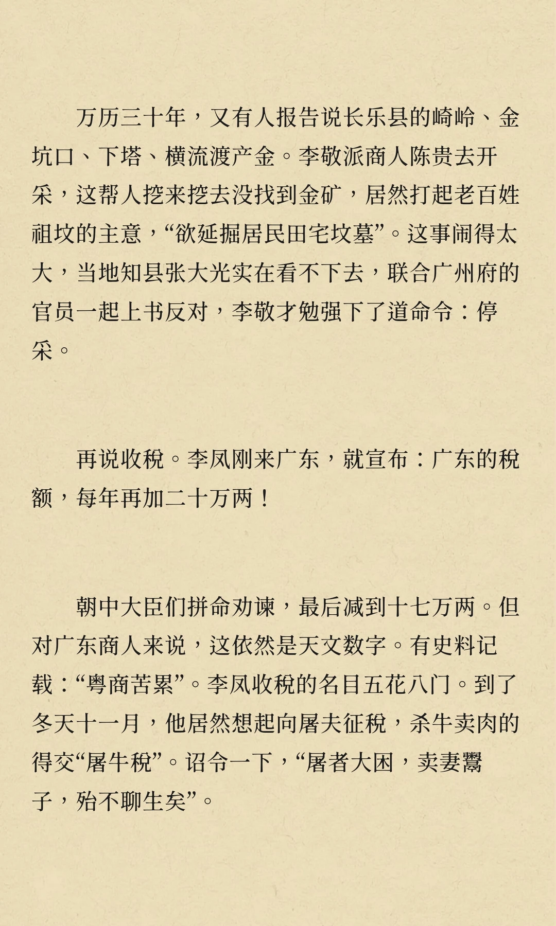 万历年间,矿税使李敬、李凤在广东开矿、收税,导致民怨沸腾,社会秩序崩溃,经济凋敝。他们的贪婪与暴政激起了多次民变,最终拖垮了广东经济,成为明朝衰败的重要标志。